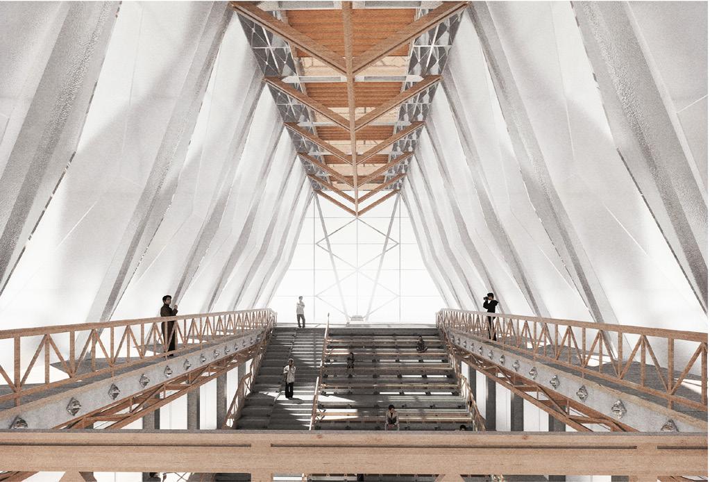 This transparent exhibition architecture changes visually from solid to ethereal depending on the viewer’s perspective. The exhibiting architecture highlights the subjective nature of seeing and the layered meanings of space. This pavilion not only does function like a traditional pavilion, but also it opens up discussions about the reinterpretation of cultural heritage within contemporary contexts.