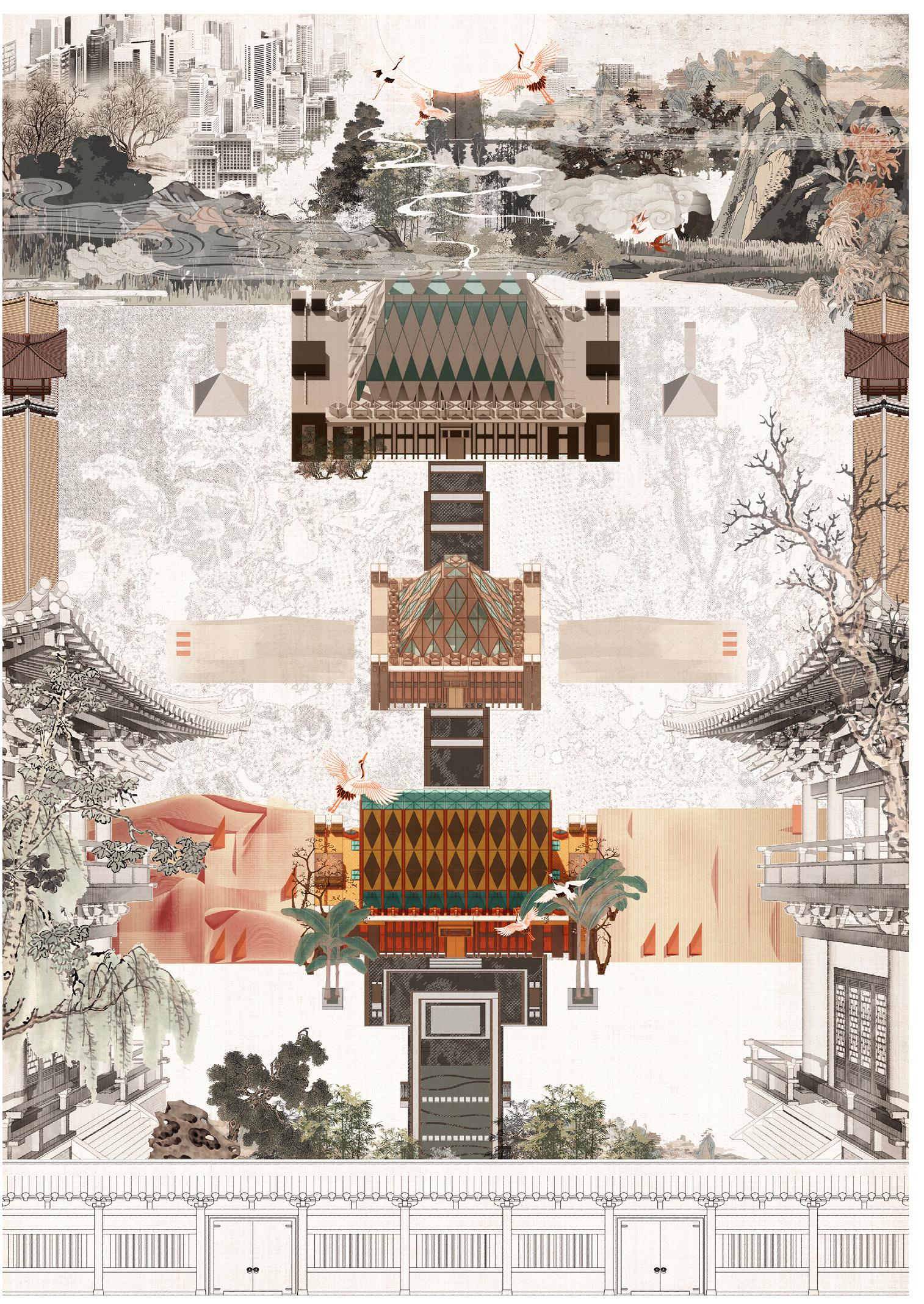 REGENERATING—is a historical reconstruction project with time penetration, which reinterprets the traditional Ming Dynasty royal palace-style architecture. The museum project consists of four layers of deformed volumes and two wings of vertical traffic flow core tubes. The deformed and stacked section organization increases the single building area and organizational capacity, showing the extremely rich topological aesthetics of the space without increasing its floor area. The overall symmetrical classic construction method is in line with the special geographical conditions of the historical site and the value requirements of future sustainable buildings. Through the combination of classic and modern building techniques, the separation effect of the building is created, "sinking, floating", which is both mysterious and monumental, compact in structure and free to stretch.