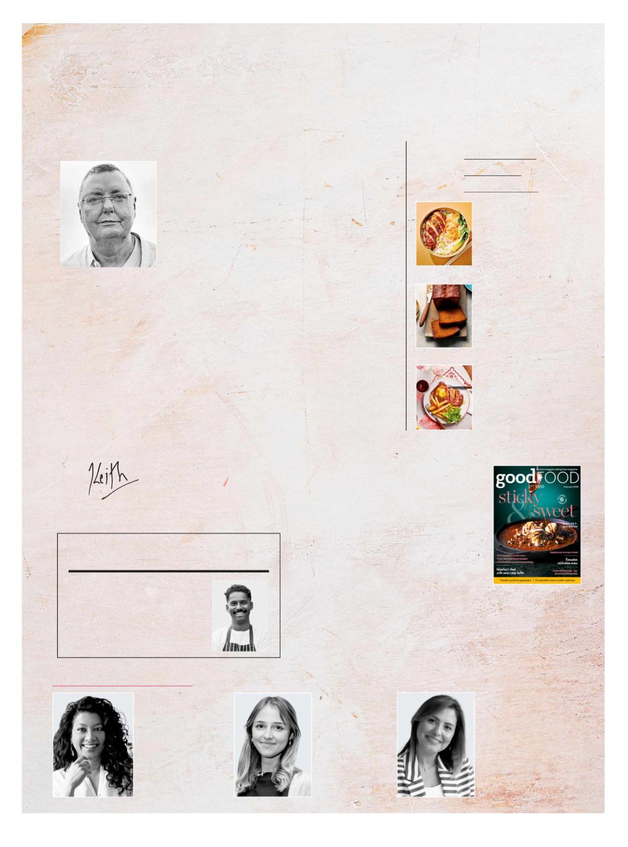 It ’s that t i me of yea r when I’m d rea m i ng of get t i ng away for a su n sh i ne holiday. I’m not a lone, r ig ht? It ’s why we’re st a r t i ng ou r new ser ies of t ravel-focu sed g u ides ( p130) to g ive u s a l l someth i ng to look for wa rd to W hat bet ter place to st a r t tha n w ith the Flor ida Keys? Ou r g u ide to the best places to eat , d r i n k a nd st ay is su re to have you open i ng up you r laptop a nd book i ng the fi rst fl ig ht to the Su n sh i ne St ate. But for now, I’m goi ng to embrace the ch i l ly even i ng s, a nd wa r m up w ith some th r if t y com for t food ( p13) – my post- Ch r ist ma s ba n k ba la nce w i l l tha n k me for it . T h is issue a lso revea ls the w i n ner of ou r new R isi ng St a rs compet it ion ( below a nd p8), wh ich scou red the nat ion for the br ig htest up-a nd-com i ng cook i ng t a lent . G eorg ia Hug hes blew away ou r judges Ma x La Ma n na a nd G ood Food ’s Ca ssie Best w ith her creat ive u se of a ba sic veget able i n her st a ndout fi na l d ish . Be su re to g ive it a t r y, a nd watch out for the r u n ners-up i n com i ng month s.