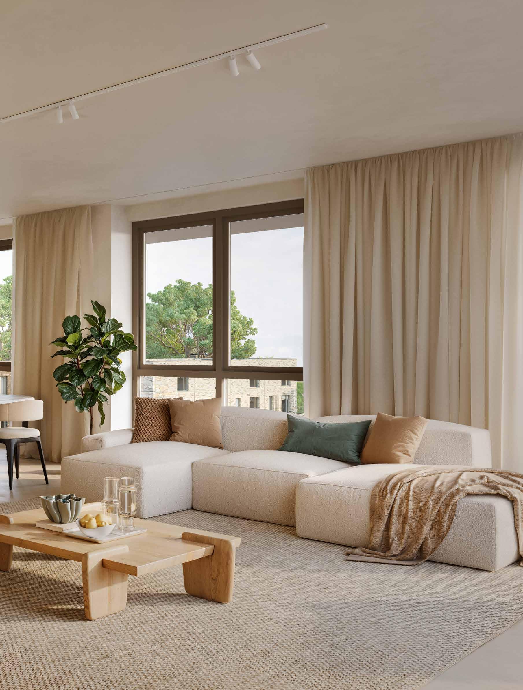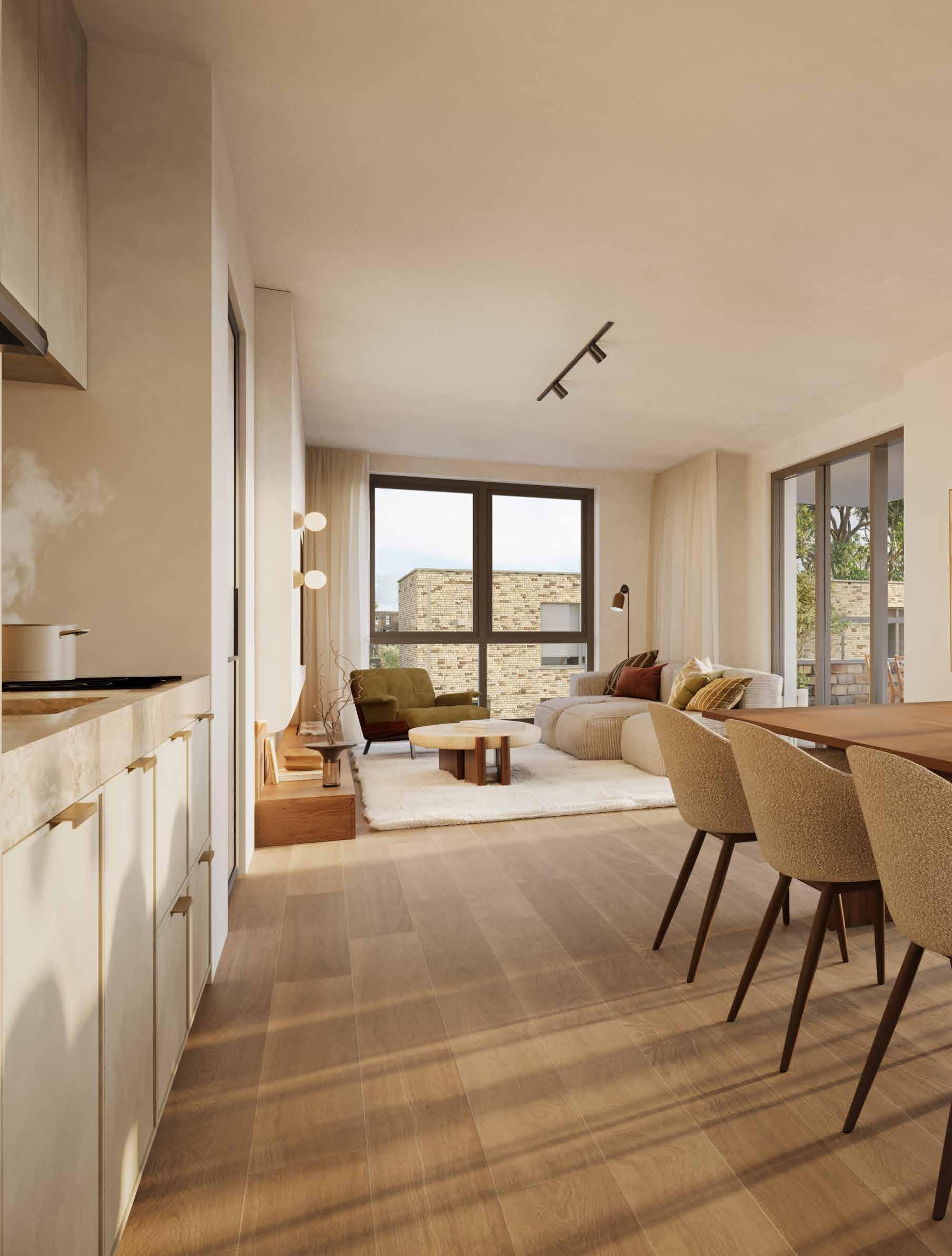 Vierkamerappartementen met duidelijk meer leefruimte. Naast de woonkamer zijn er extra kamers voor werken aan huis, hobby’s of logees. De open indeling en de overhoekse buitenruimte zorgen voor een ruimtelijk gevoel en geven uitzicht over de wijk en het landschap.