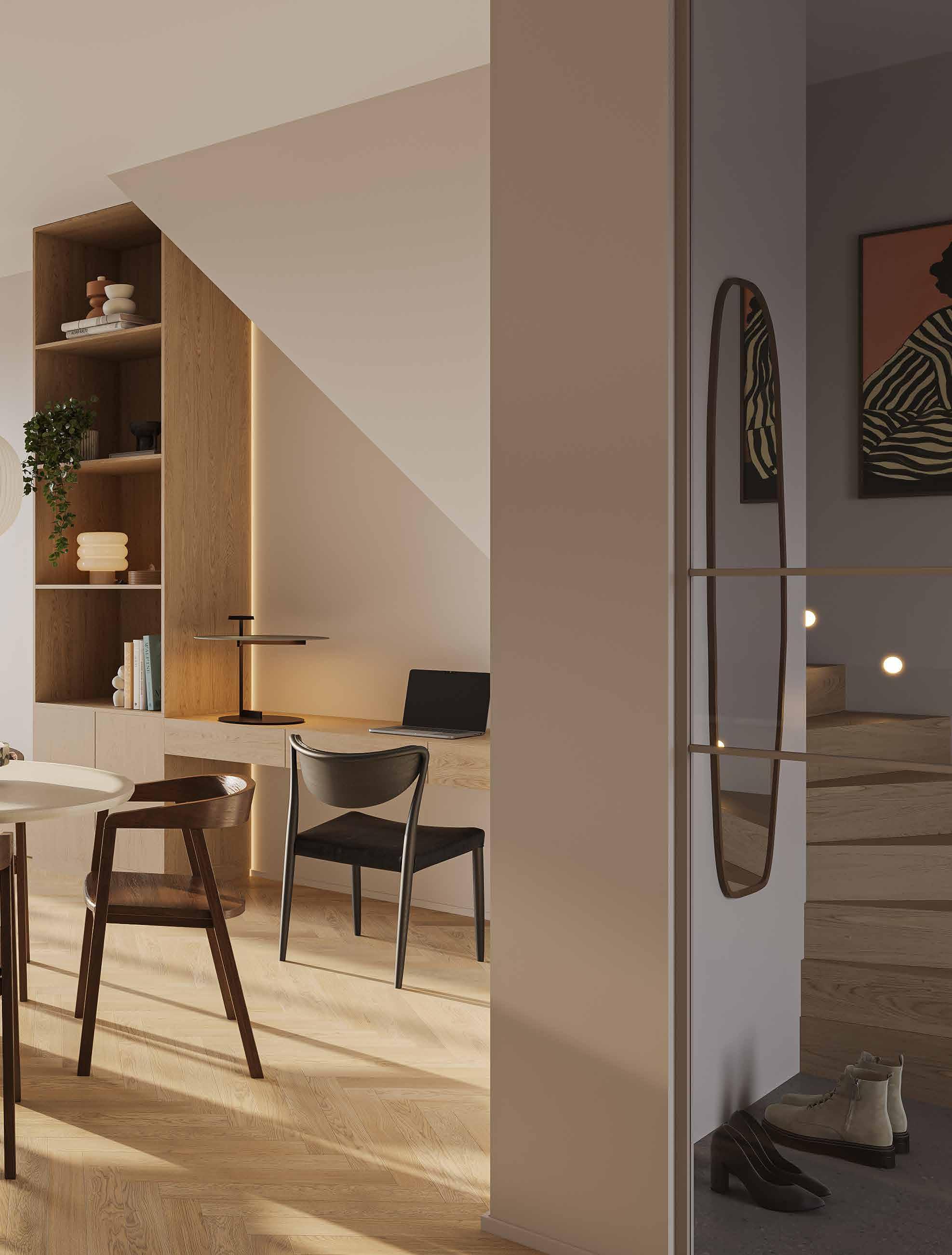 Zes appartementen met een extra kamer. Door de grote ramen en de hoekligging valt er veel daglicht binnen. Het royale balkon is in sommige gevallen zelfs overhoeks, waardoor het ruimer aanvoelt en je verder uitkijkt over de wijk en het landschap. Door de kleinschalige opzet van het gebouw deel je de verdieping met slechts twee andere buren.