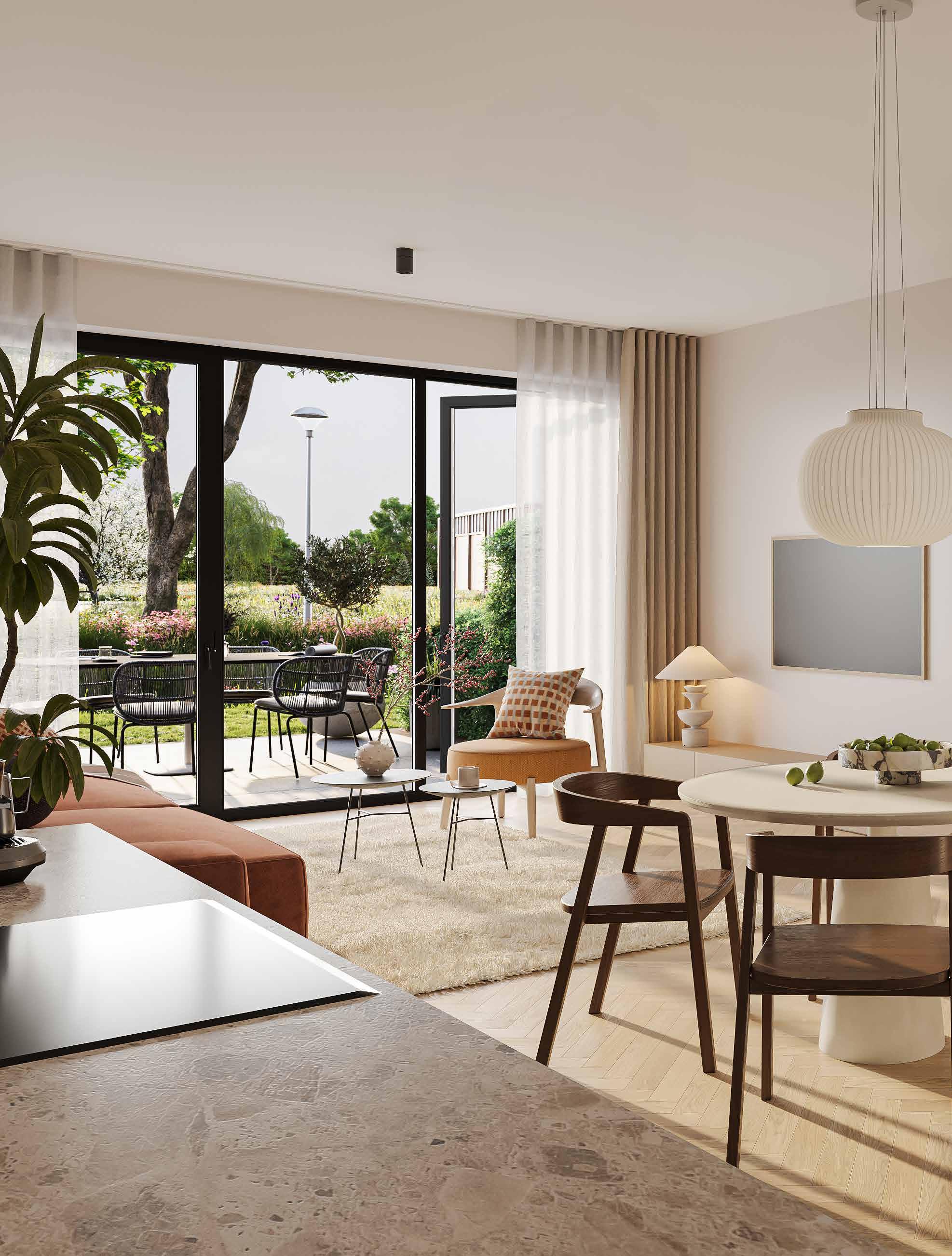 De 44 twee-, drie- en vierkamerappartementen geven gelijkvloers woongemak met een royale woonkamer en open keuken als middelpunt. De fijne buitenruimte, het uitzicht en het licht maken dat je elke dag weer geniet van het mooie rivierenlandschap. De woonoppervlakten variëren tussen de ca. 41 en 152 m²; de buitenruimtes tussen de ca. 4 en 44 m².