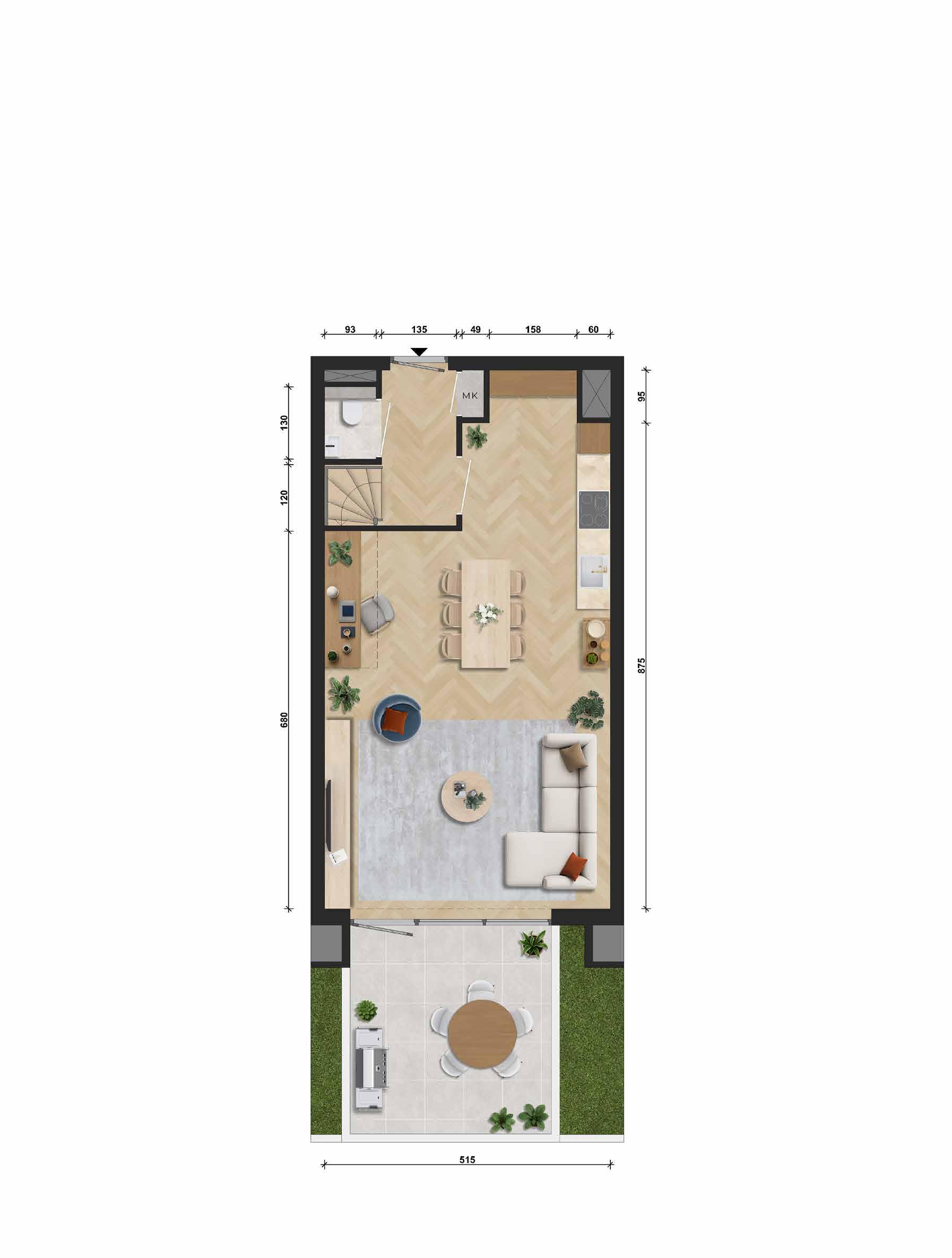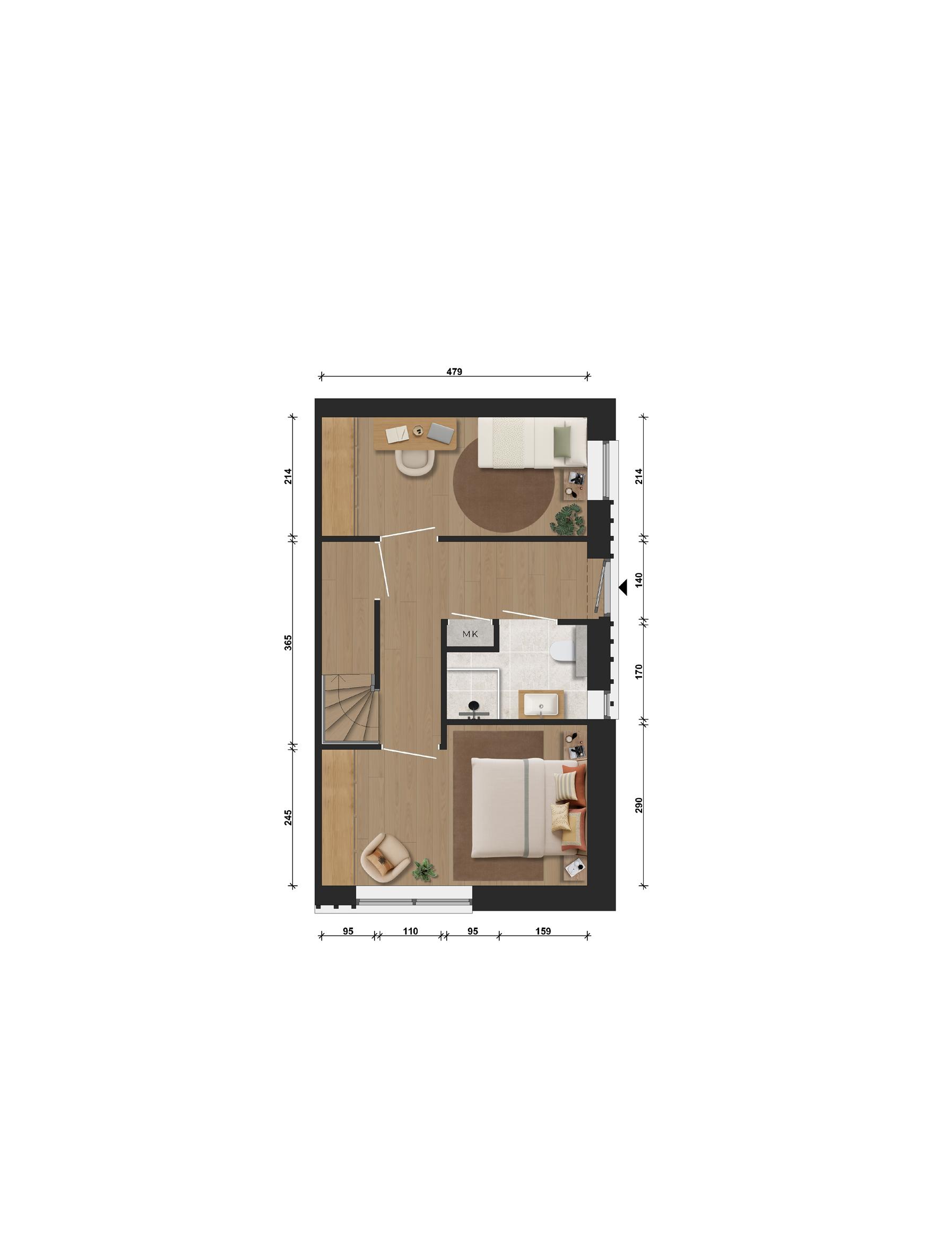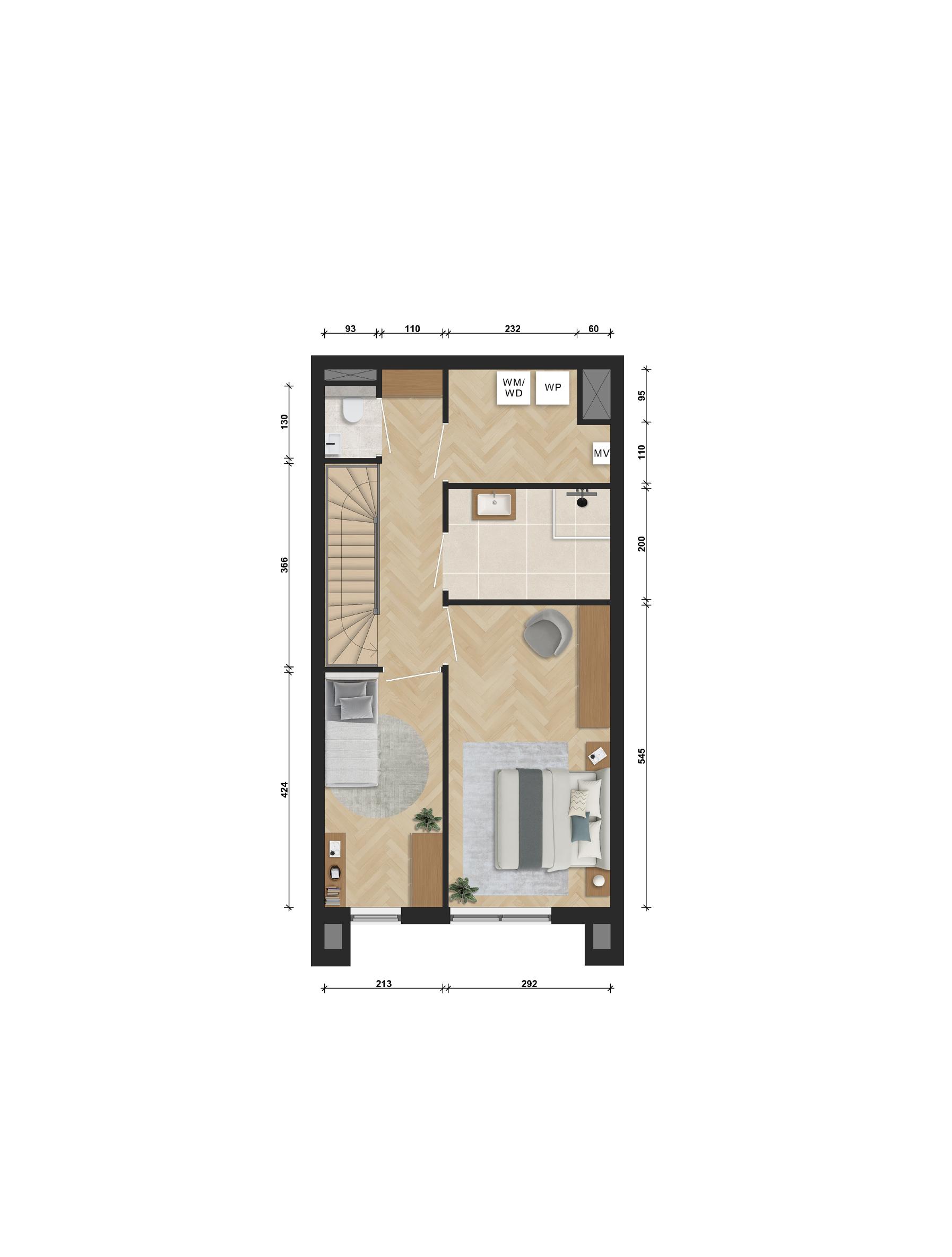 Deze woningen zijn geschikt voor een (klein) gezin of voor wie wonen en werken wil combineren. Op de begane grond zijn twee slaapkamers en een badkamer. Via de trap kom je in de grote living met open keuken en een balkon op de eerste verdieping. Bouwnummer A15.14 heeft tevens een extra terras op de begane grond.
