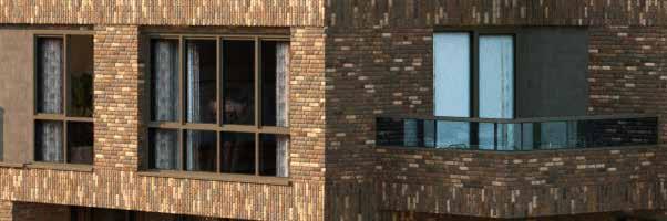 De appartementen hebben twee verschillende kleuren metselwerk. Metselwerk met donkergrijze voeg