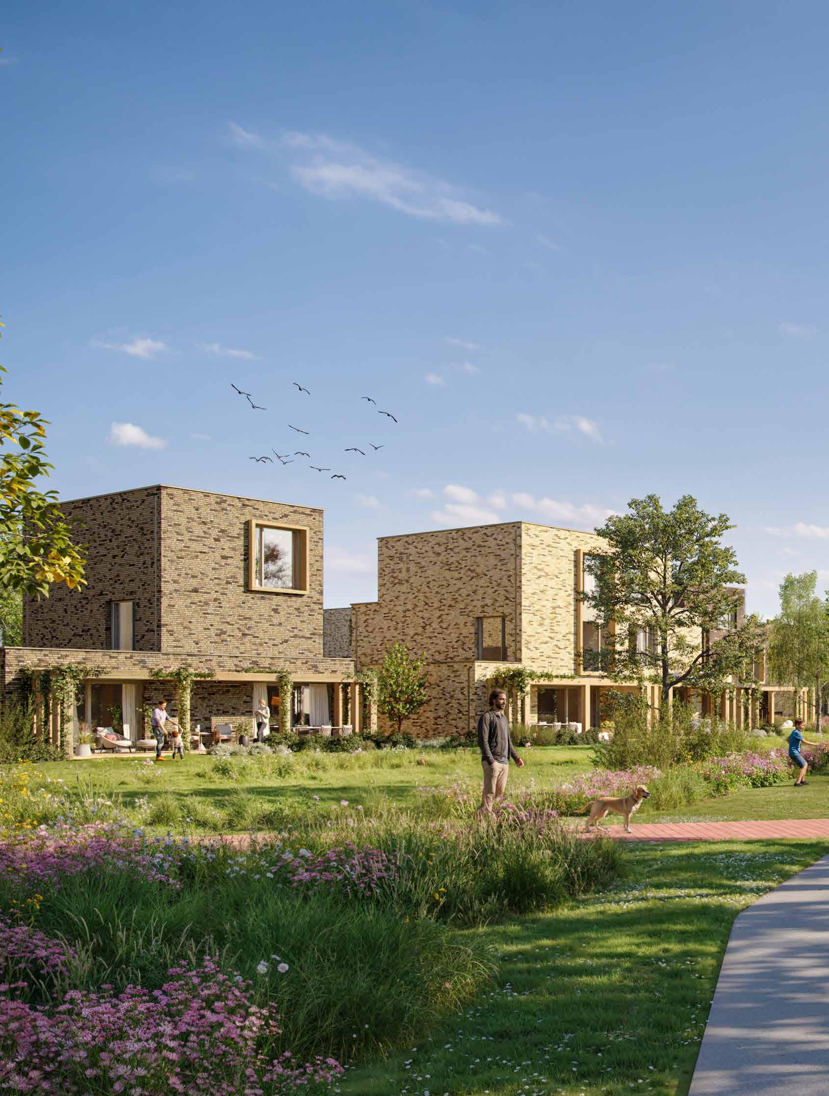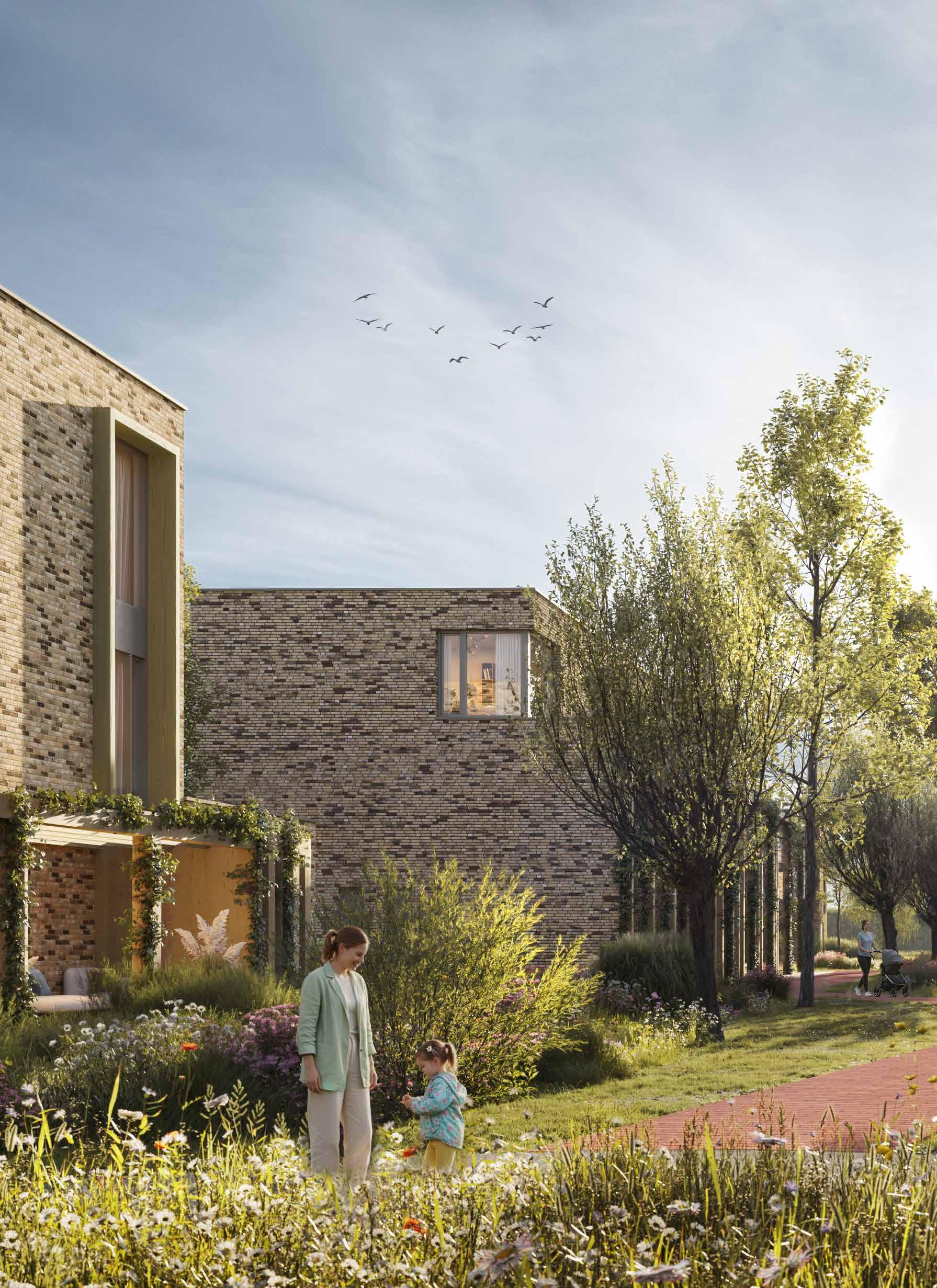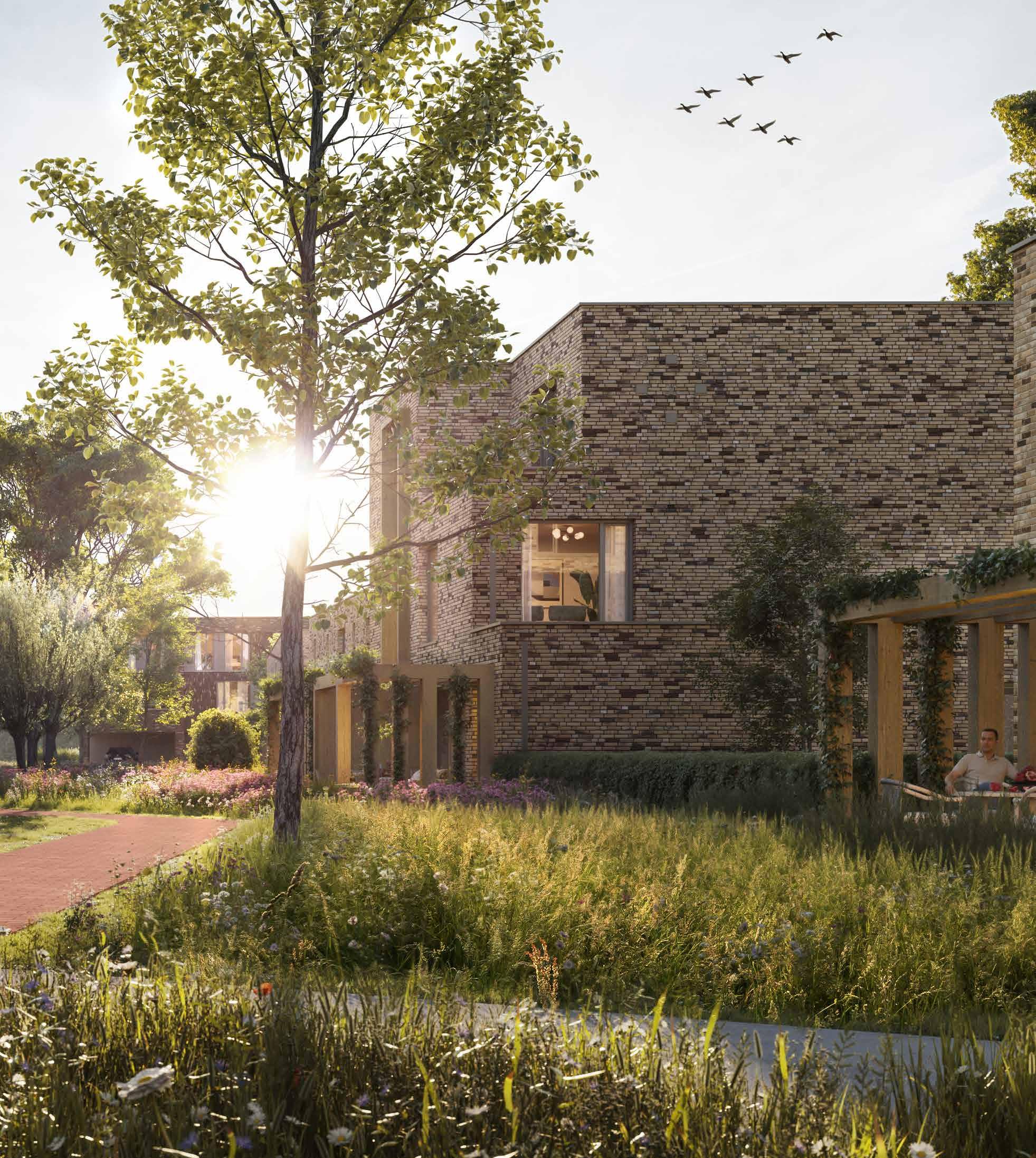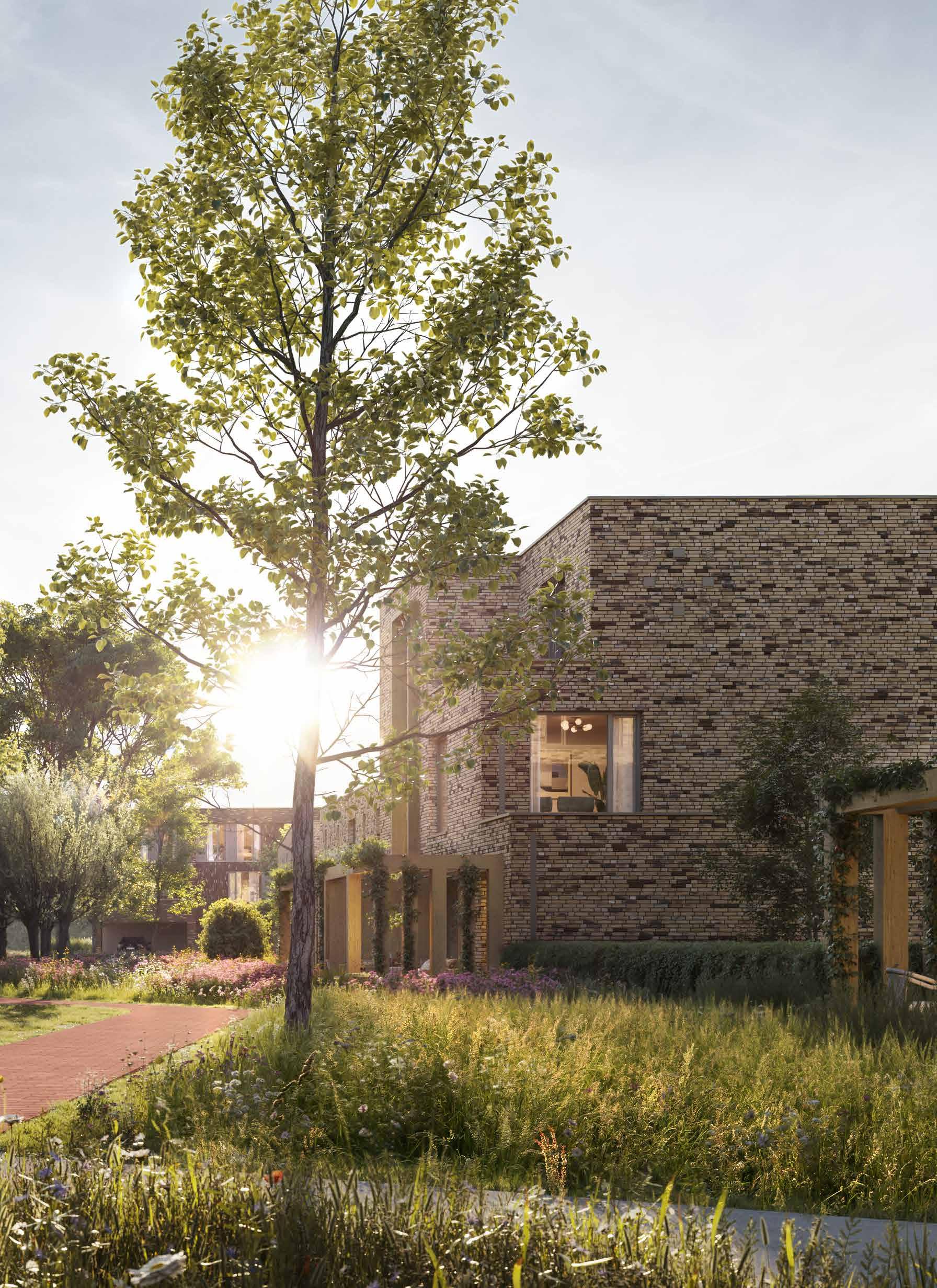 Natuur dichtbij. De hofwoningen staan midden in het groen. Pergola’s vormen de overgang tussen woningen en landschap. Paden zorgen voor verbinding.