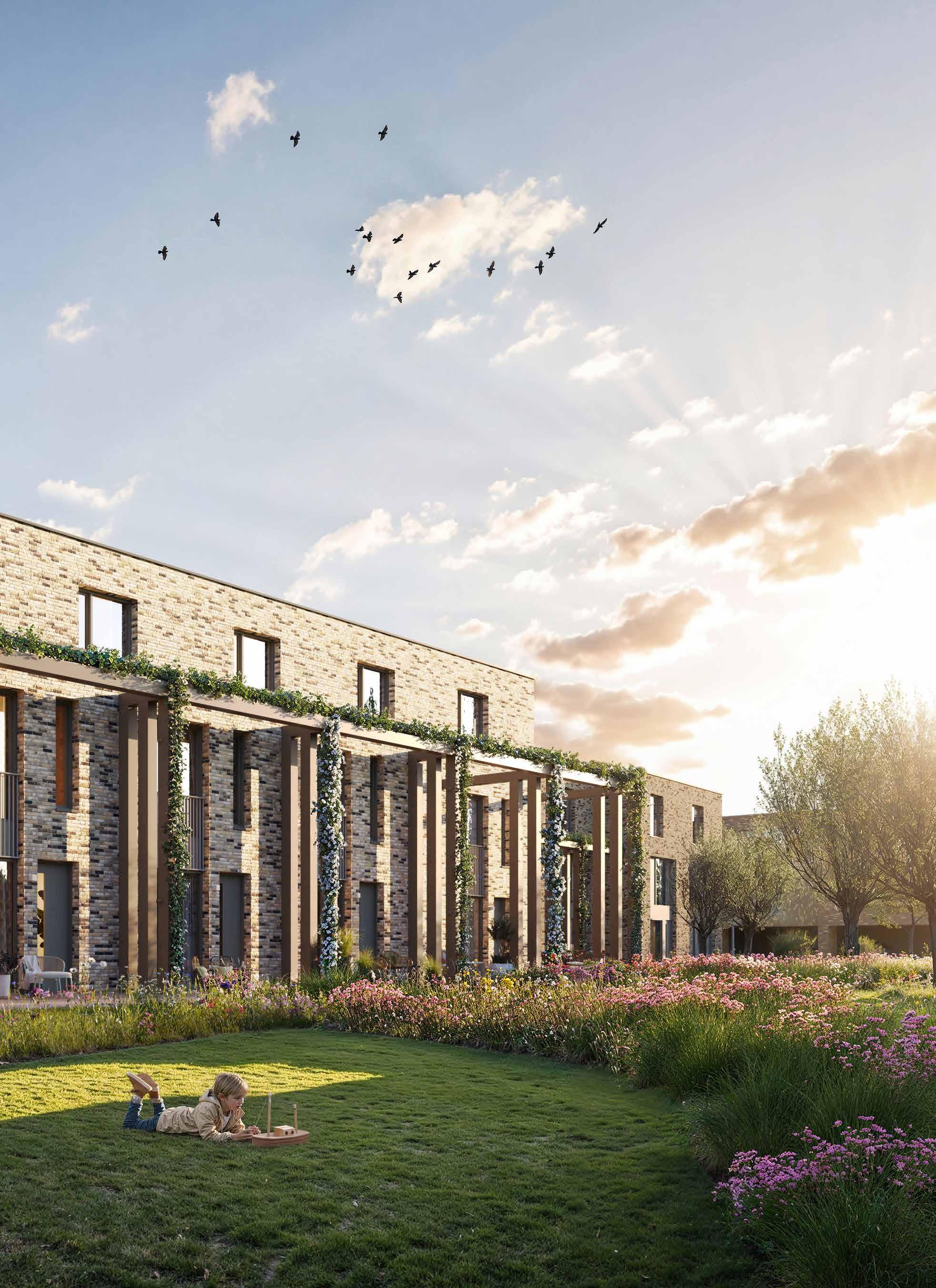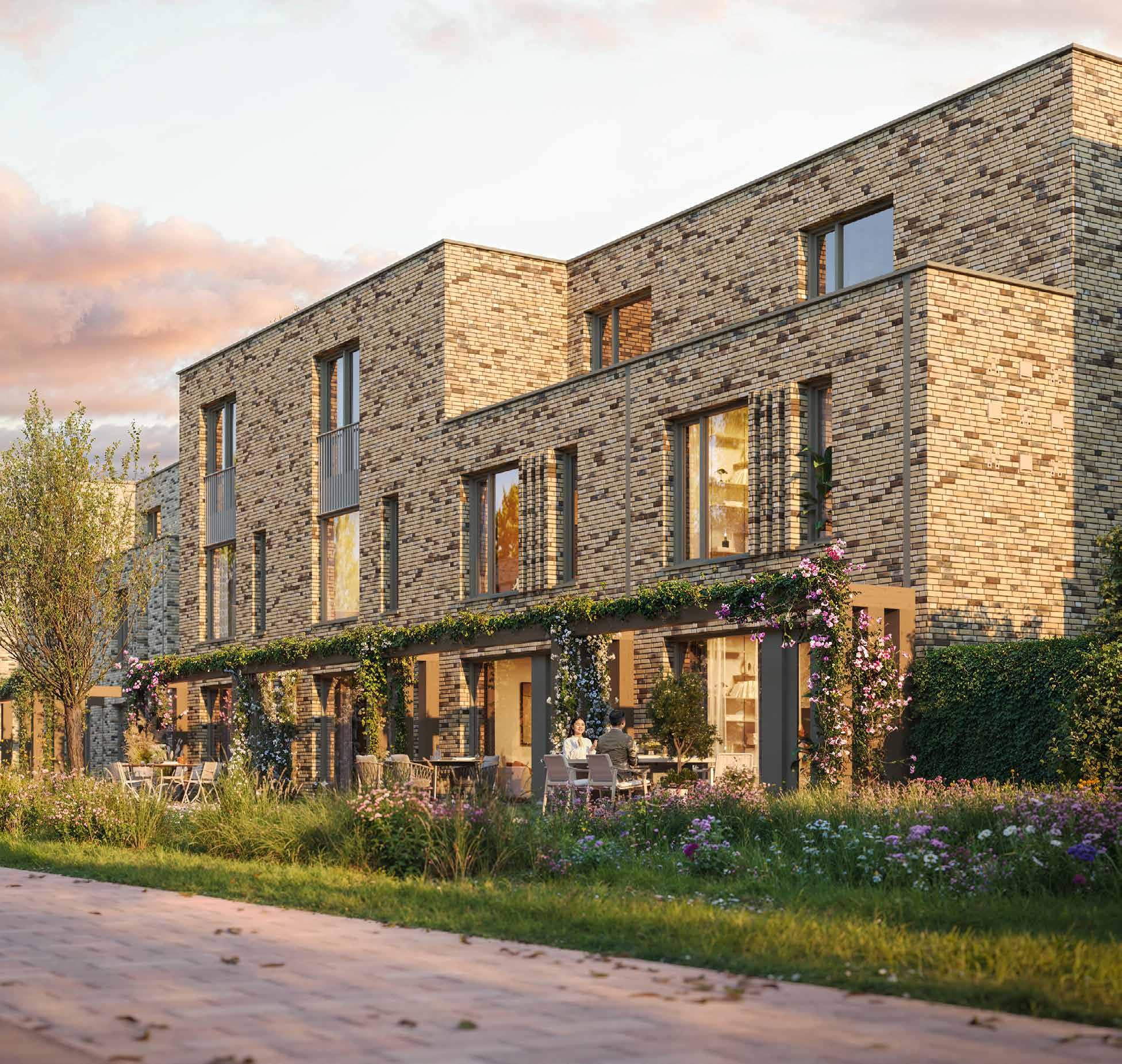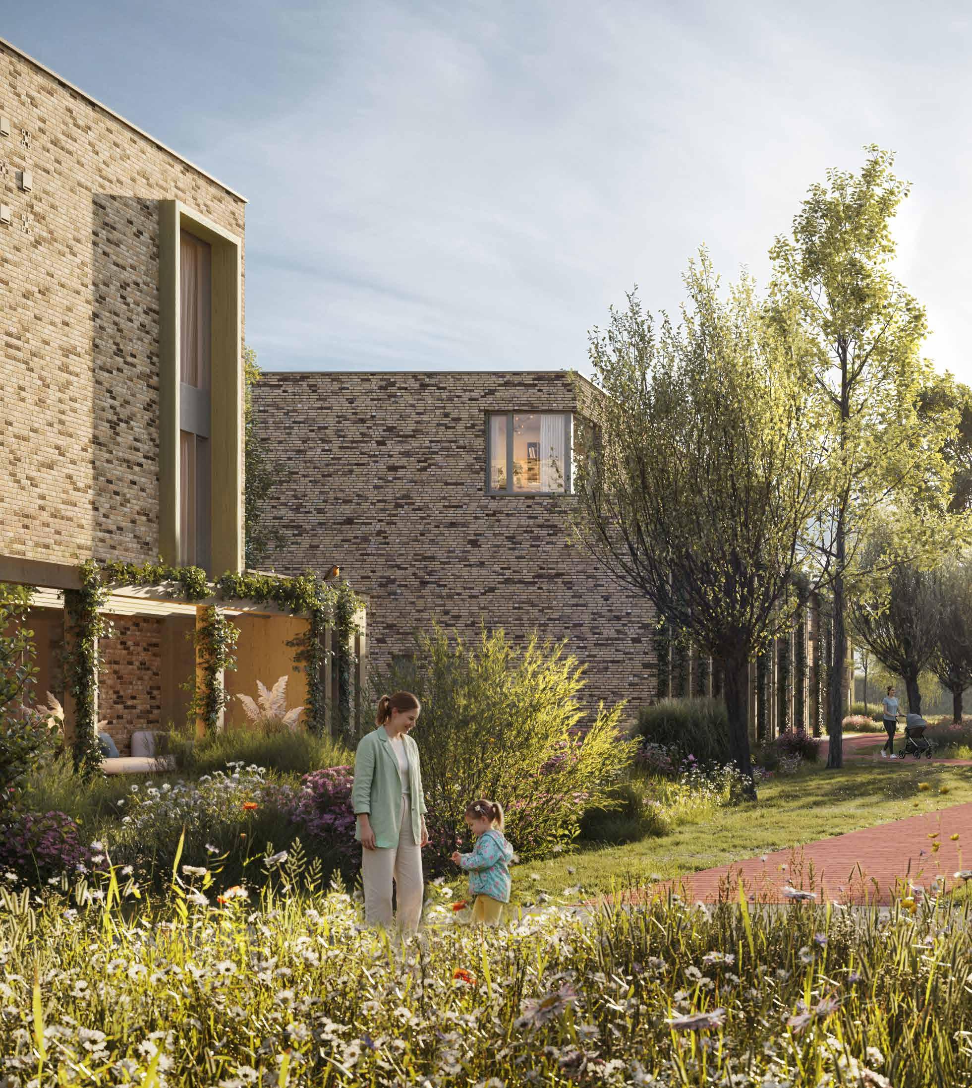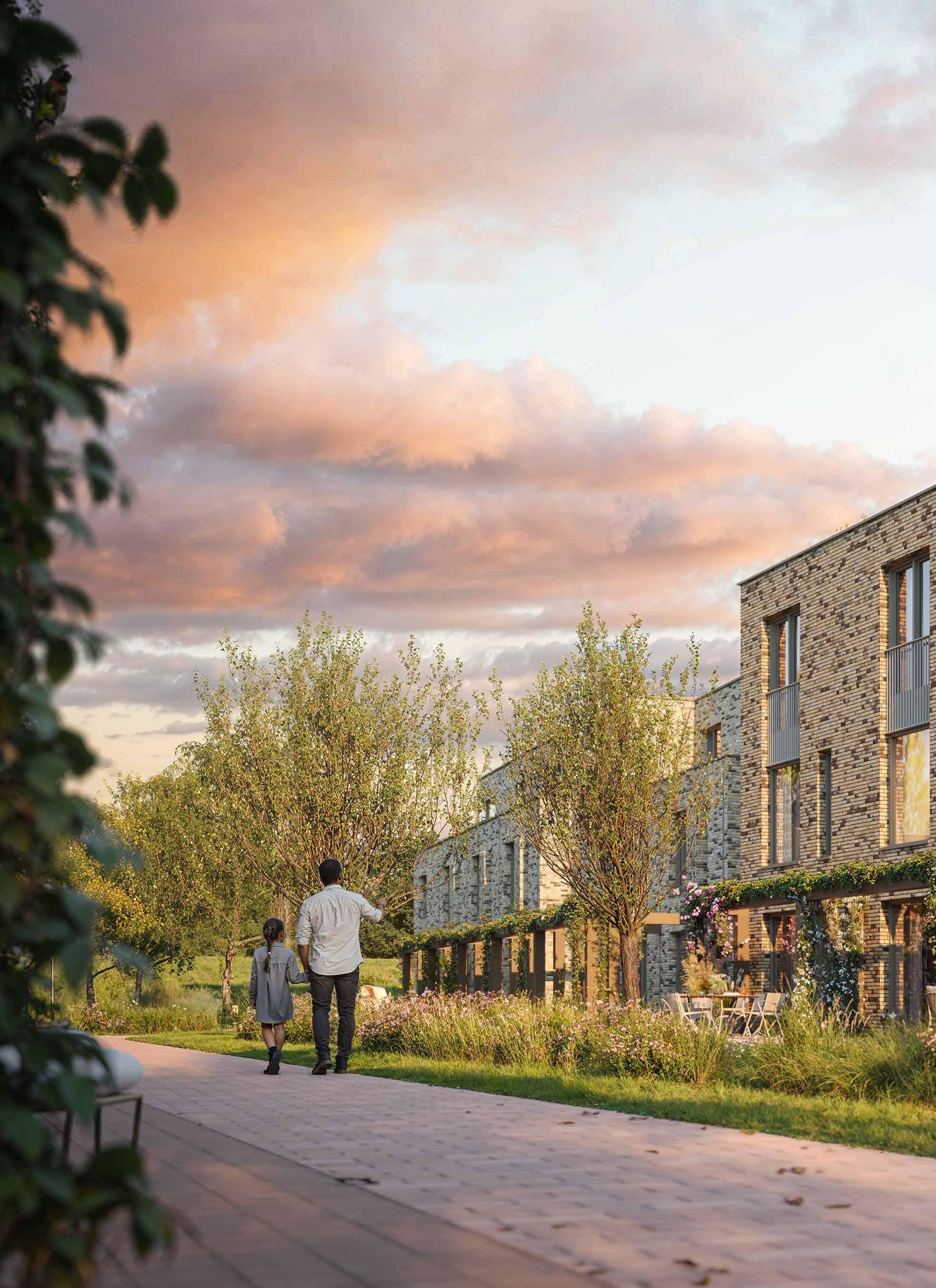 Natuur dichtbij. De hofwoningen staan midden in het groen. Pergola’s vormen de overgang tussen woningen en landschap. Paden zorgen voor verbinding.