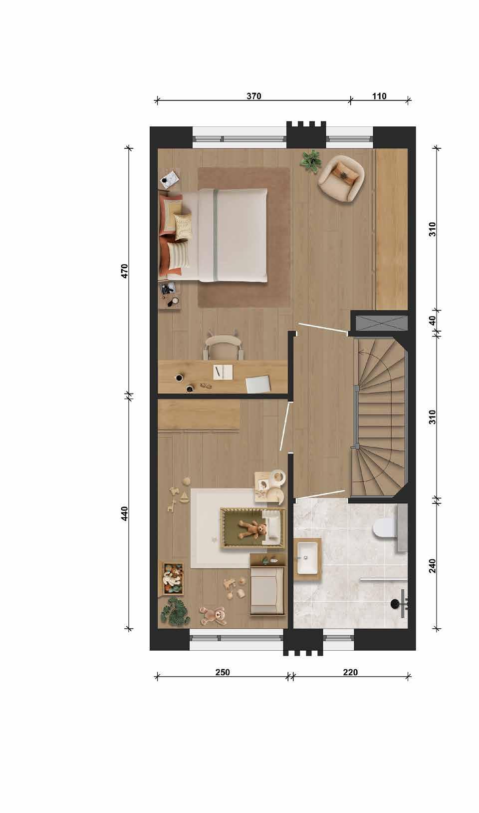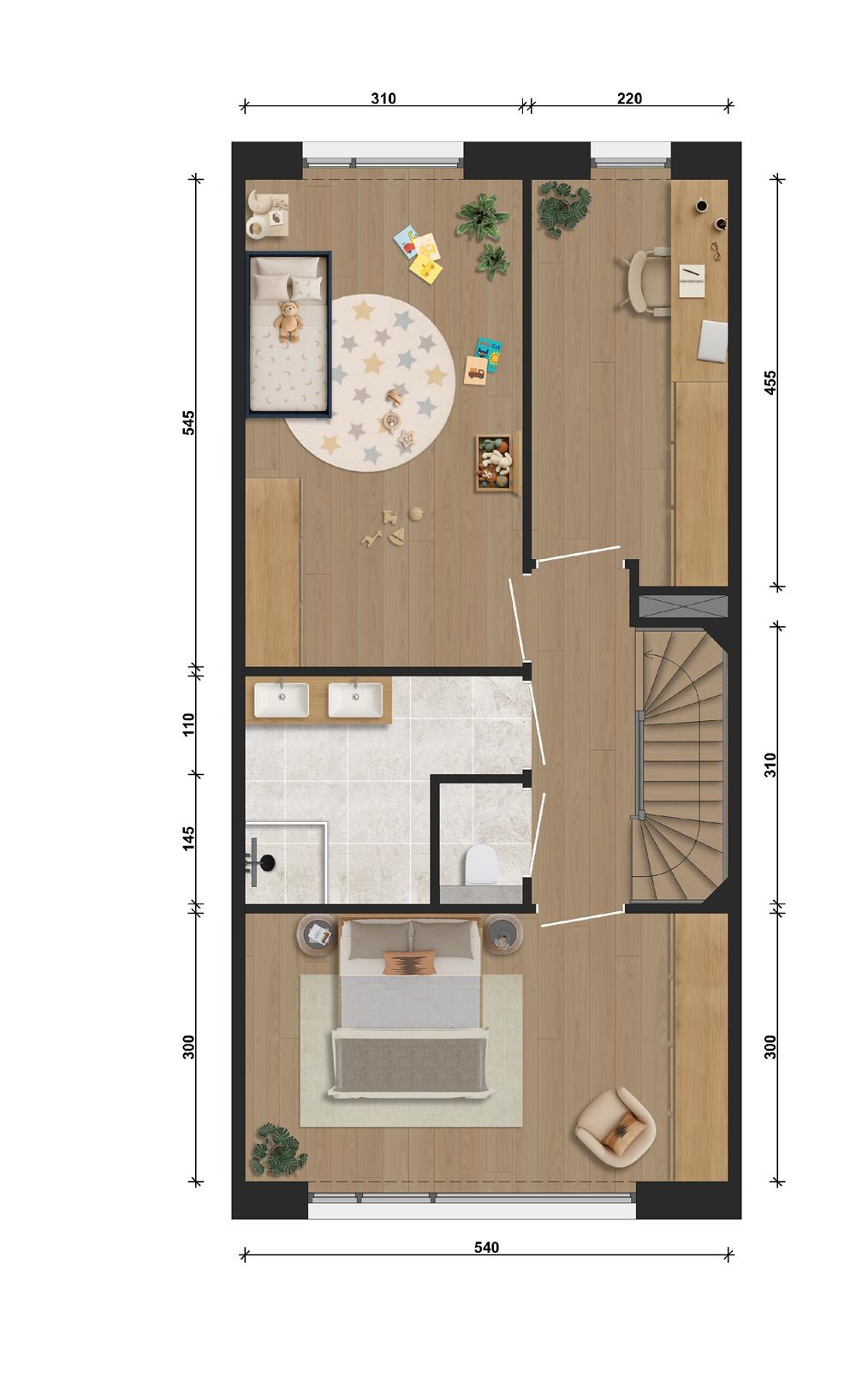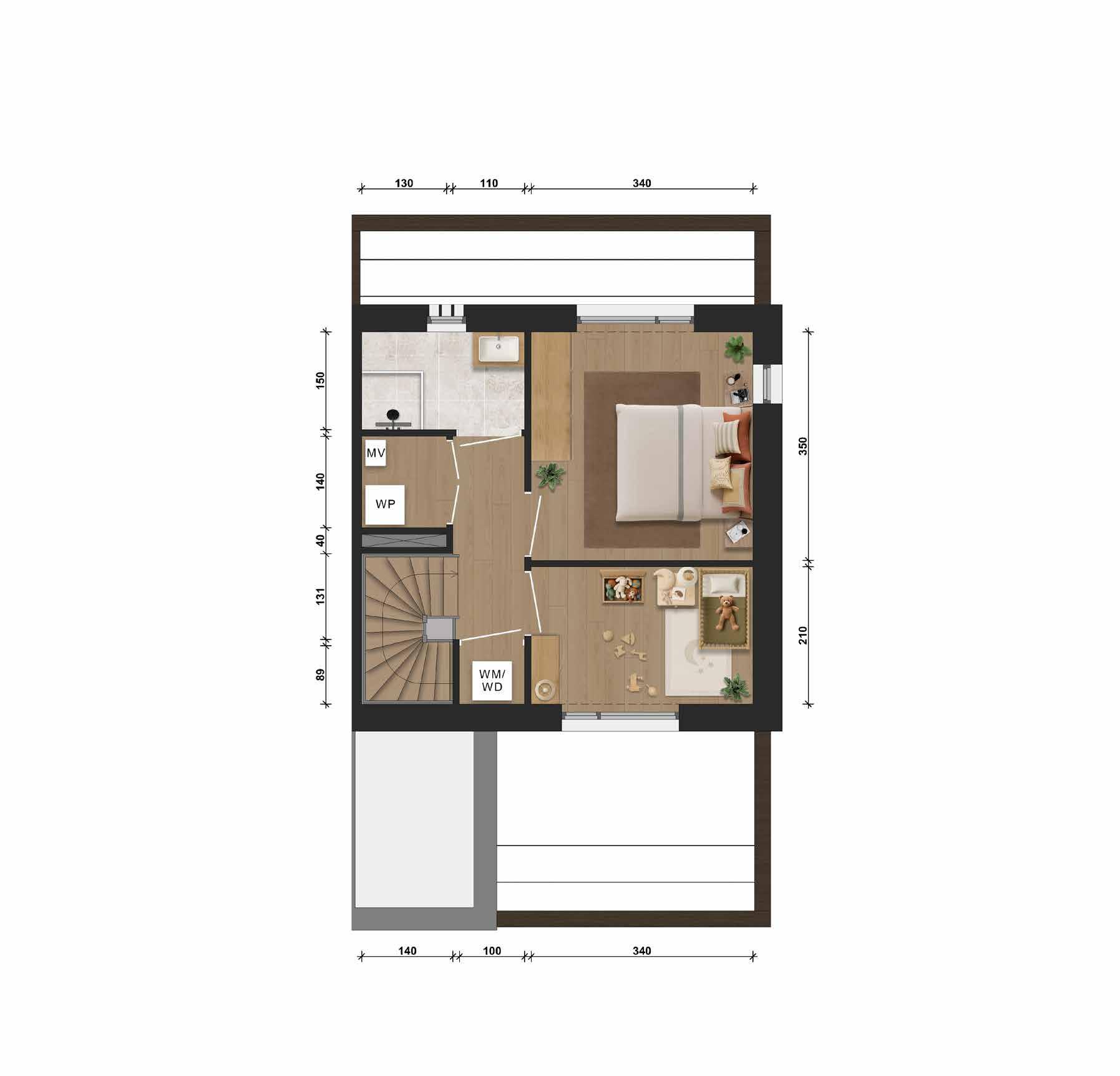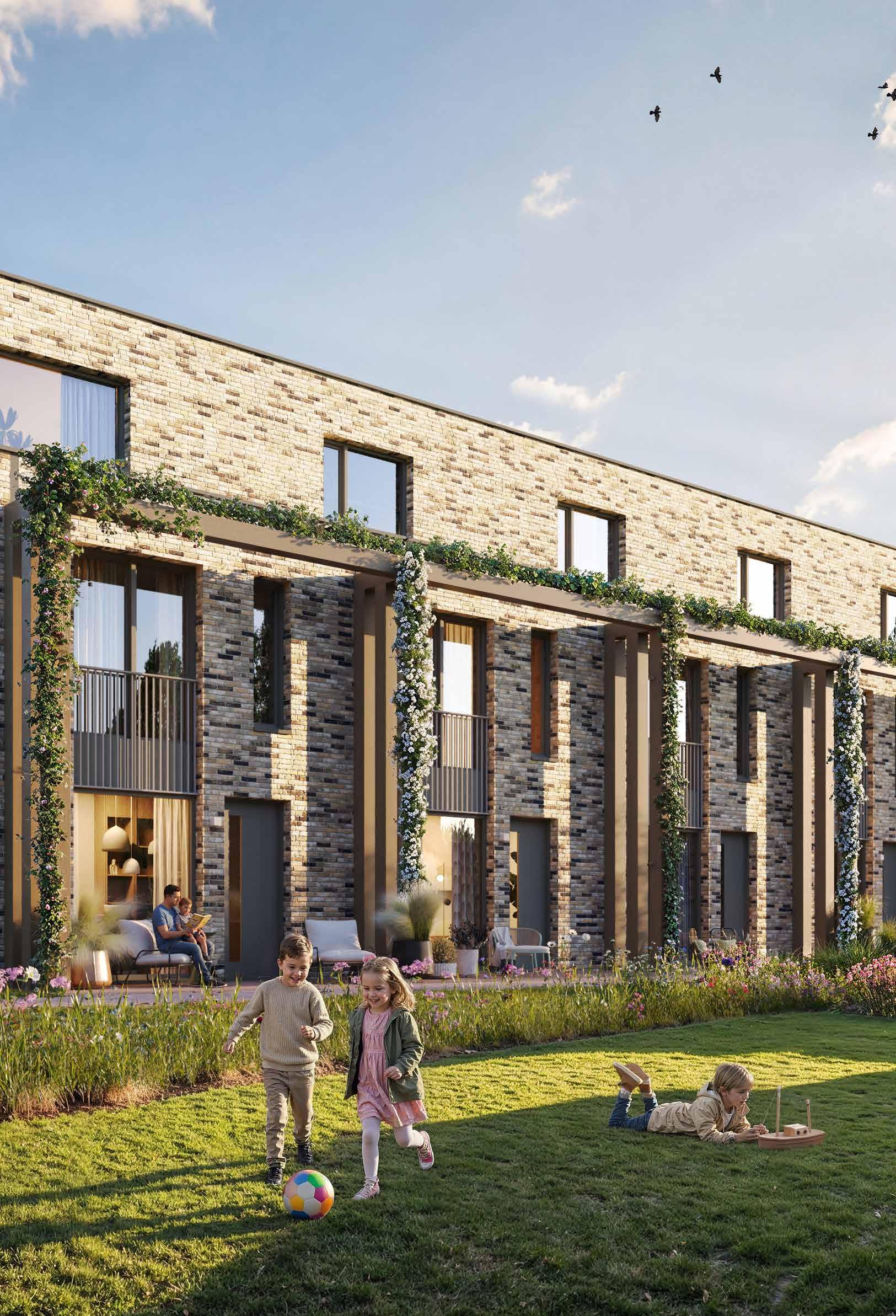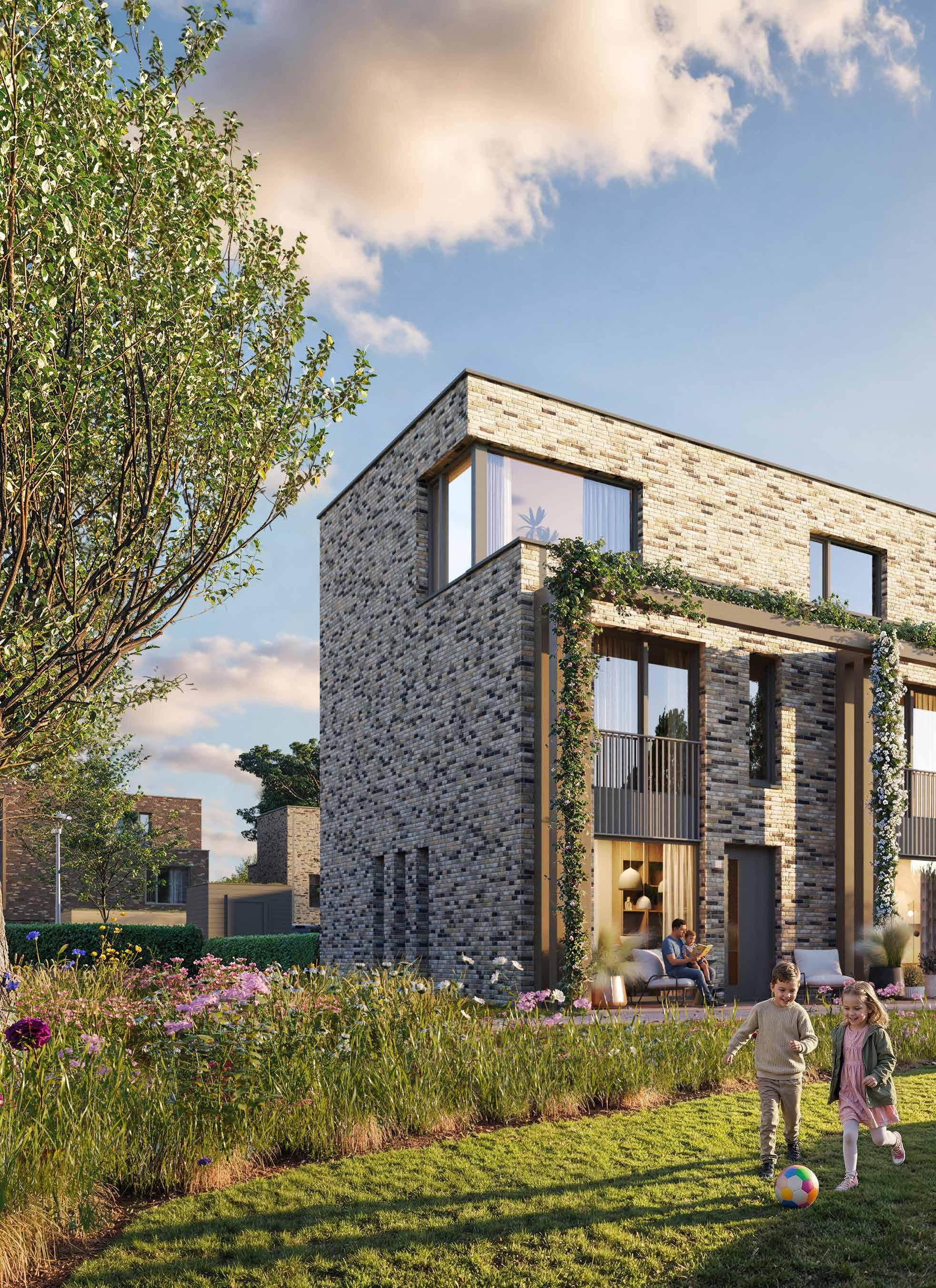 In het midden van de wijk vind je vier riante hoekwoningen met net wat meer privacy en ruimte om je huis. Elk met ca. 169 m² aan woonplezier. De begane grond is om te koken en samen te zijn. Op de verdiepingen zijn vijf slaapkamers. De tuin ligt op het zuiden en meet ca. 70 m².