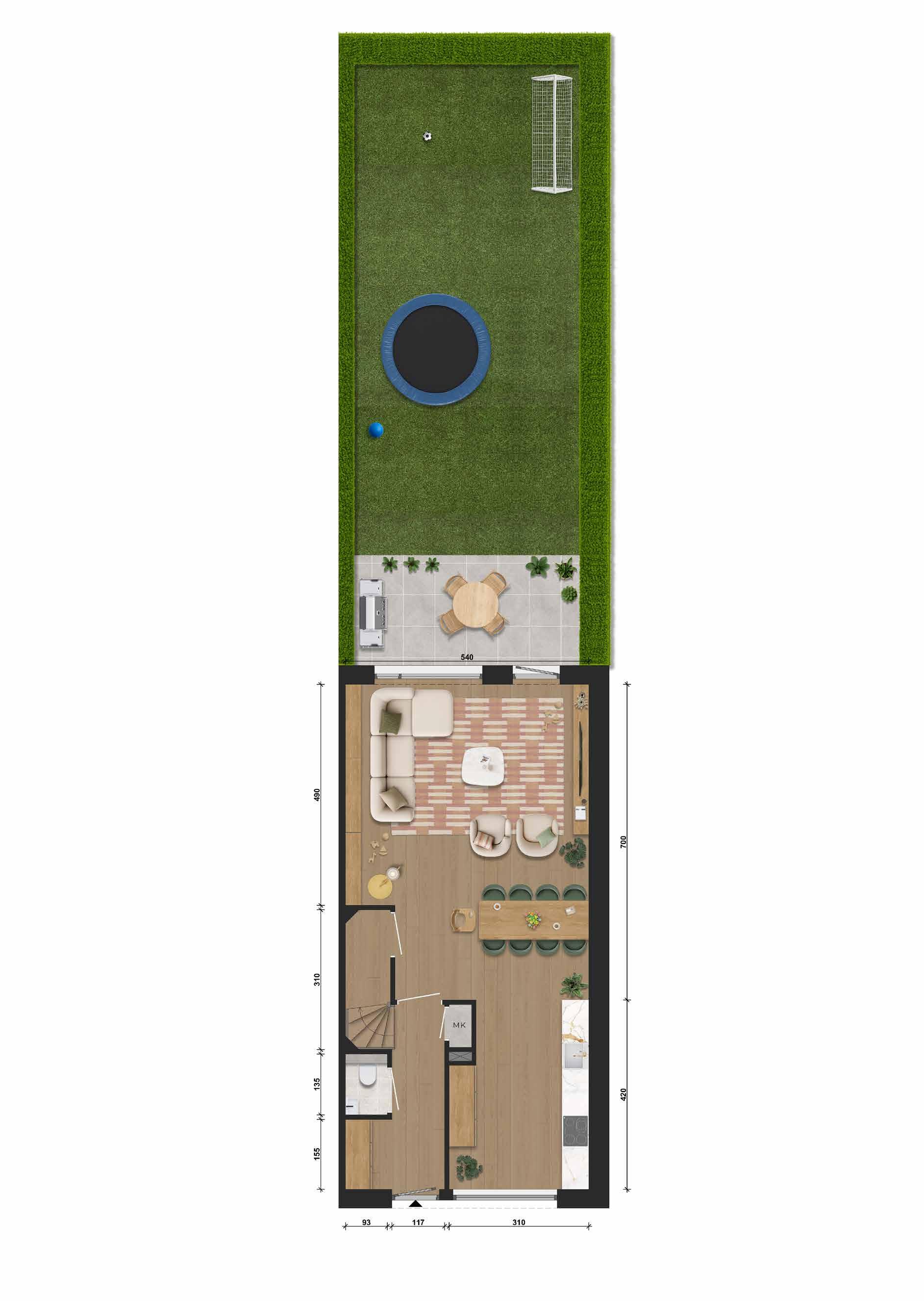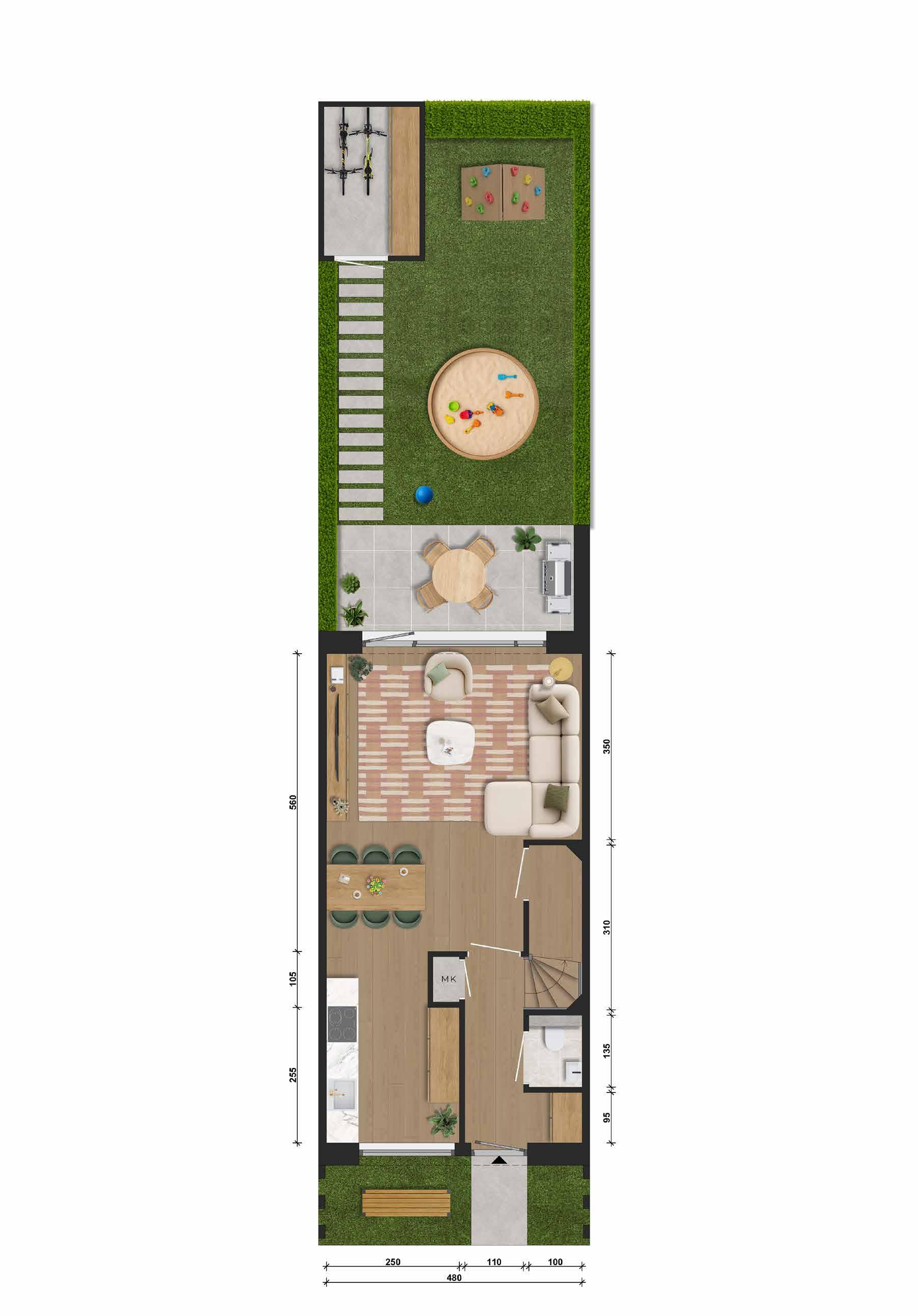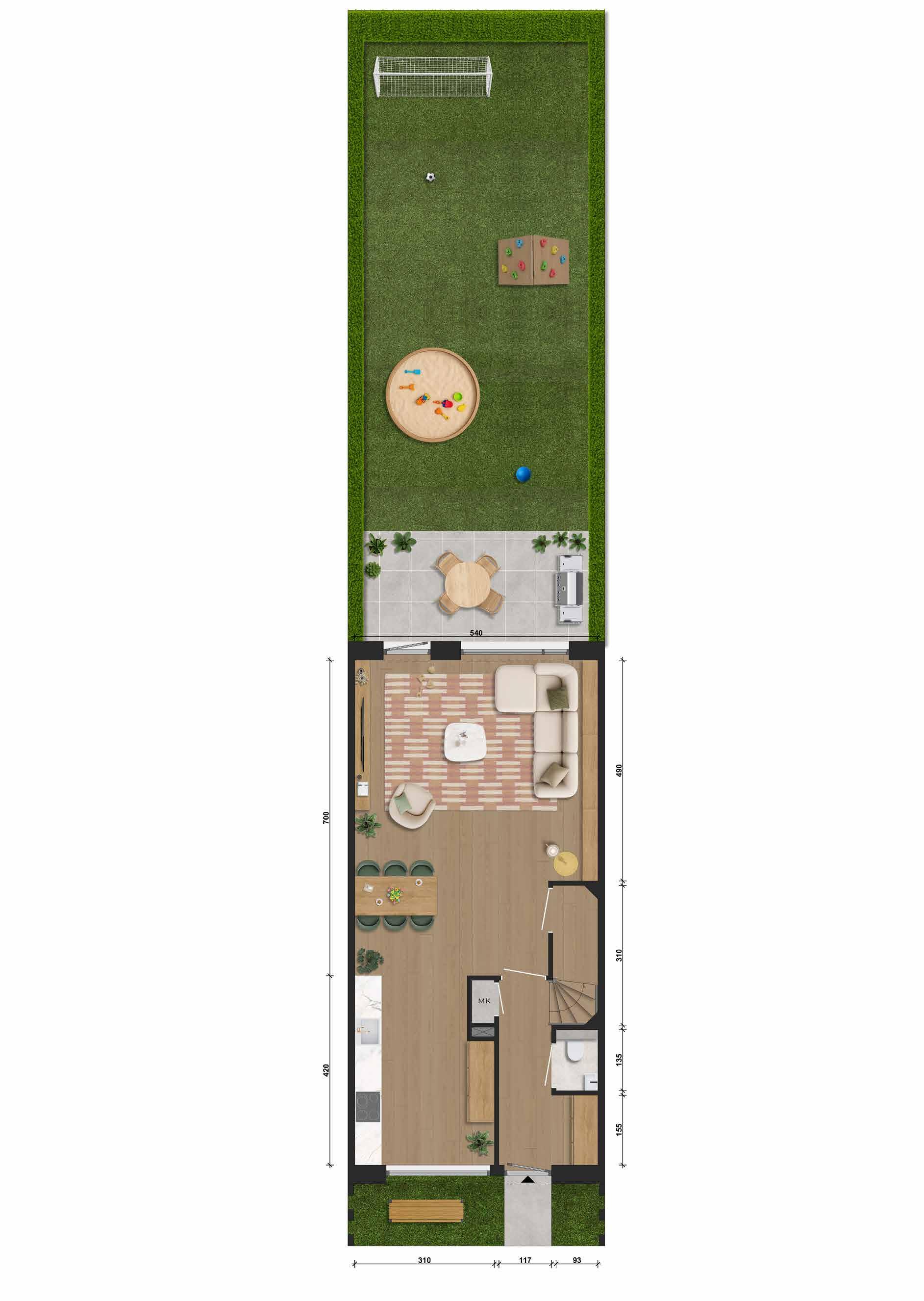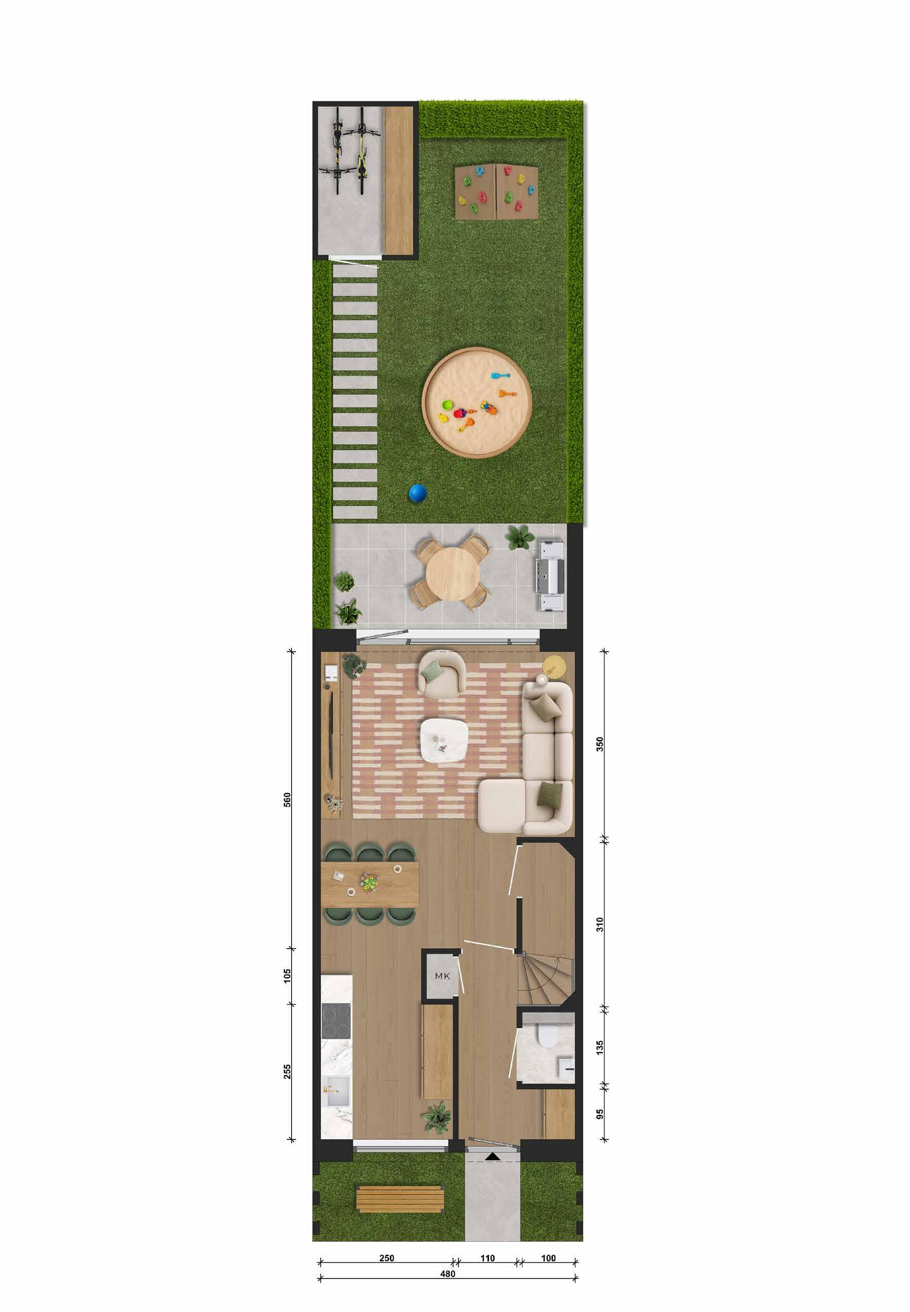 Aan de randen van de hofjes liggen de hoekwoningen van ca. 119 tot 121 m². Door de ligging op de hoek ervaar je net wat meer ruimte en privacy. Op de begane grond is ruimte om te koken en samen te zijn. Op de verdiepingen vind je meerdere slaapkamers die je kunt gebruiken om te slapen, werken of hobby’s uit te oefenen. Vanuit de woonkamer stap je zo de tuin in, terwijl je aan de voorzijde uitkijkt over het groene hof.