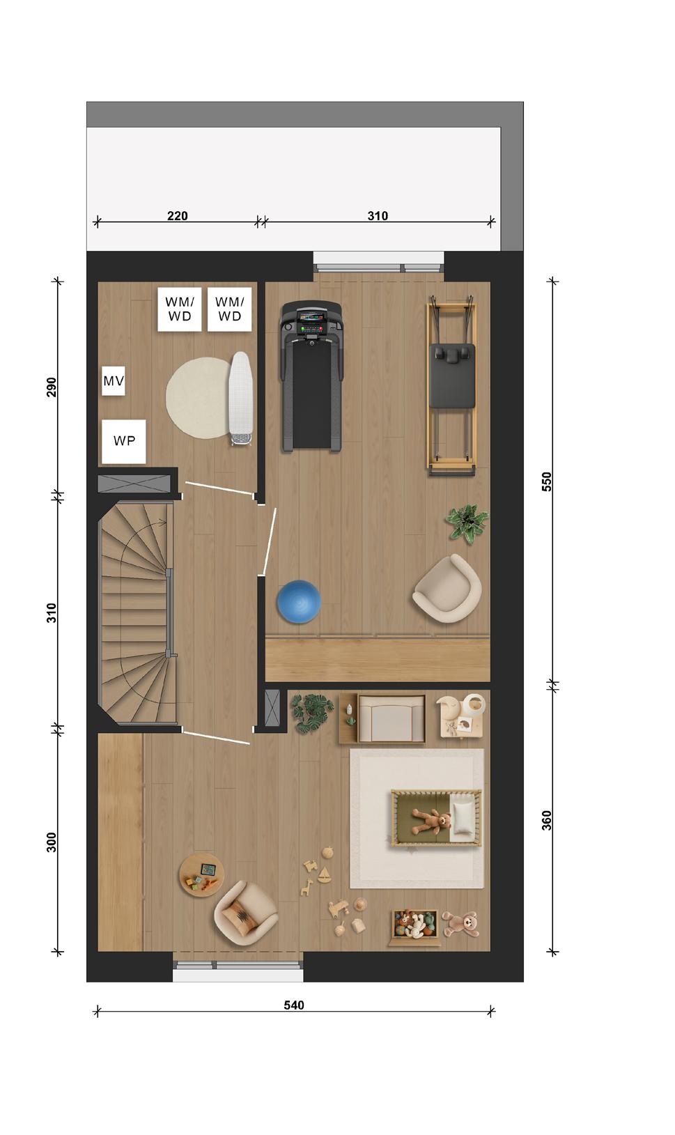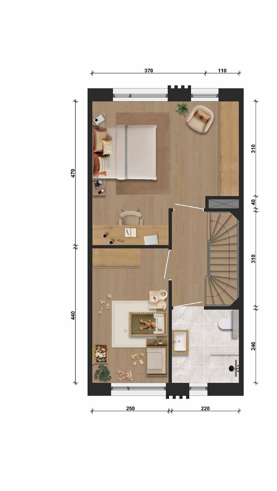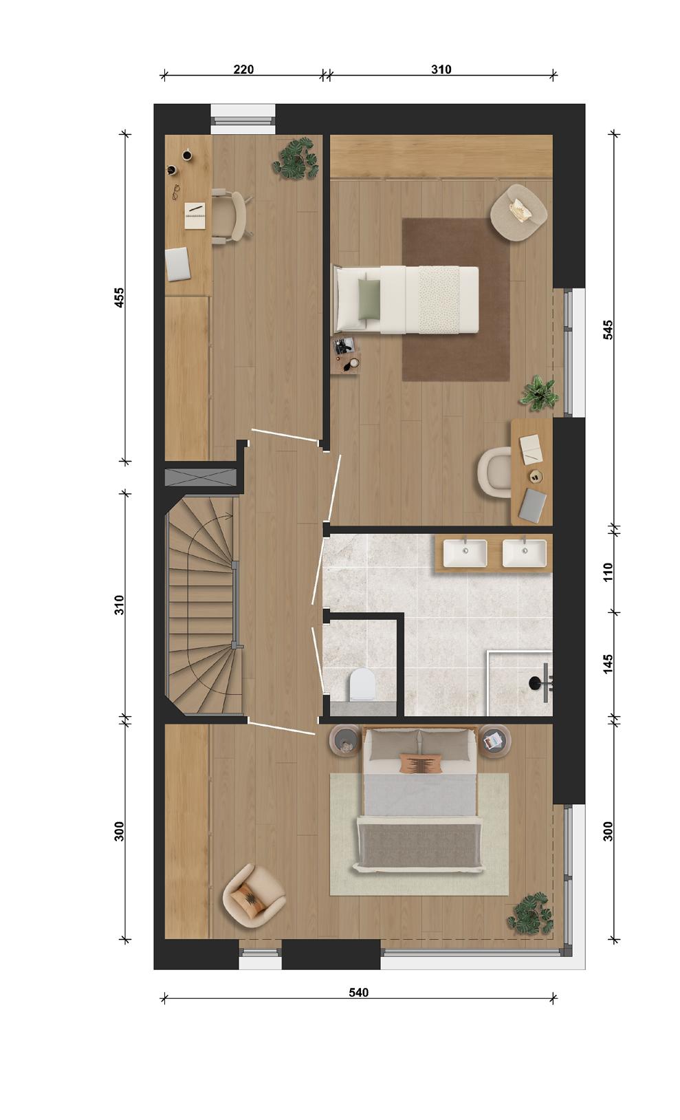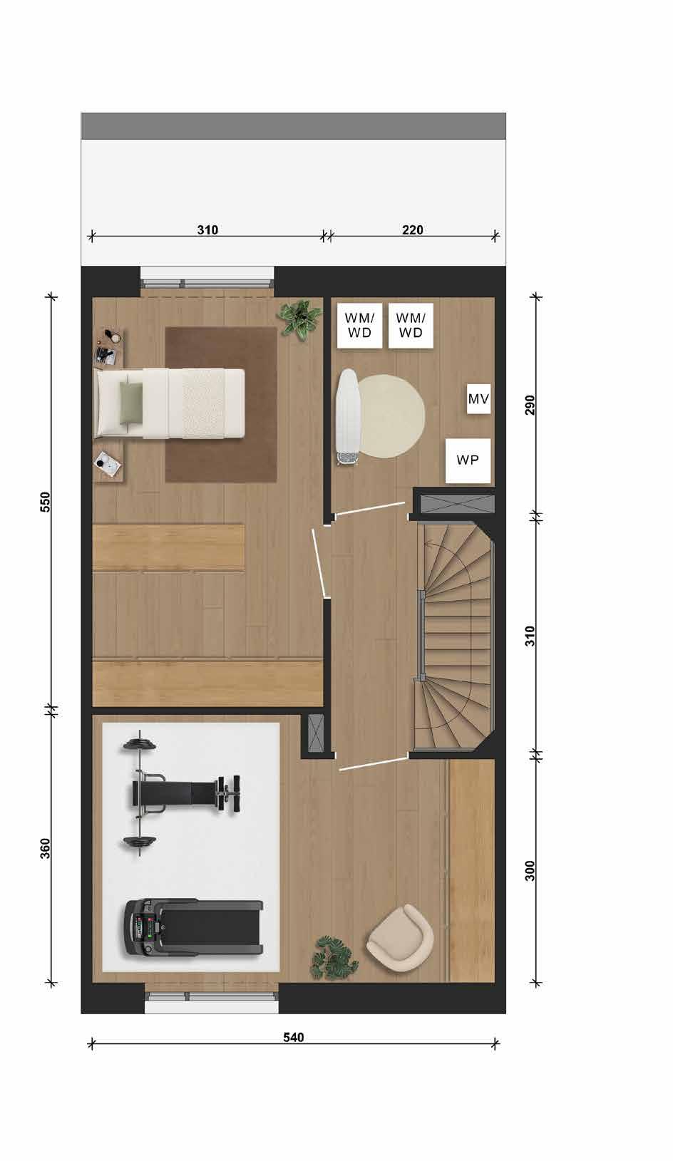 Aan de randen van de hofjes liggen de hoekwoningen van ca. 119 tot 121 m². Door de ligging op de hoek ervaar je net wat meer ruimte en privacy. Op de begane grond is ruimte om te koken en samen te zijn. Op de verdiepingen vind je meerdere slaapkamers die je kunt gebruiken om te slapen, werken of hobby’s uit te oefenen. Vanuit de woonkamer stap je zo de tuin in, terwijl je aan de voorzijde uitkijkt over het groene hof.