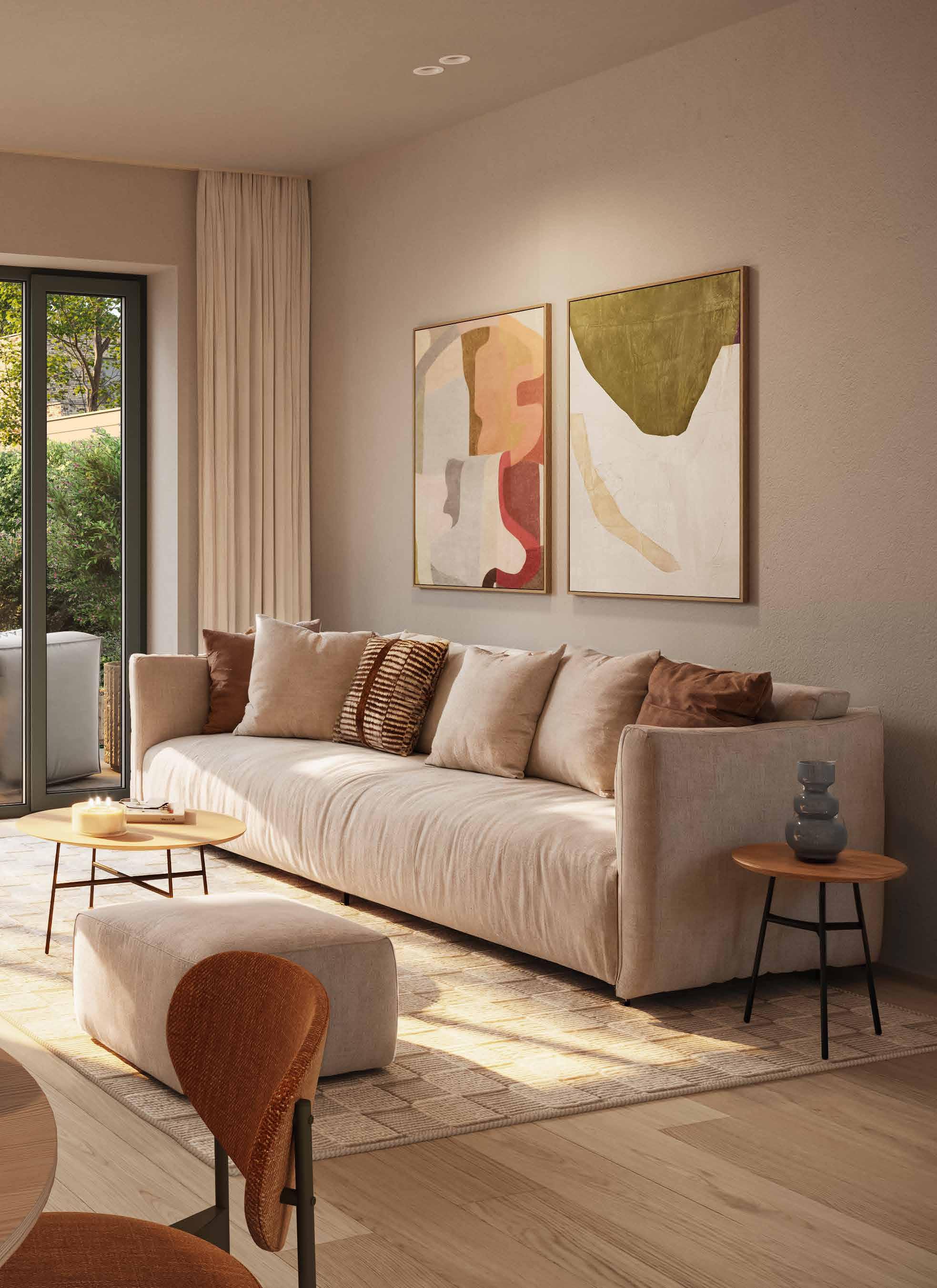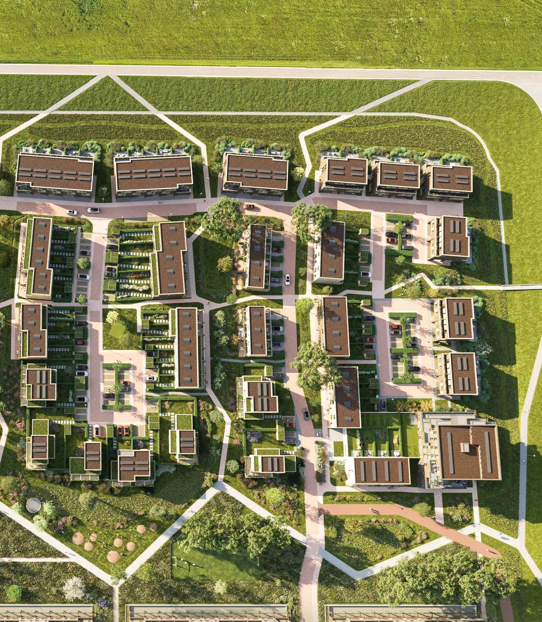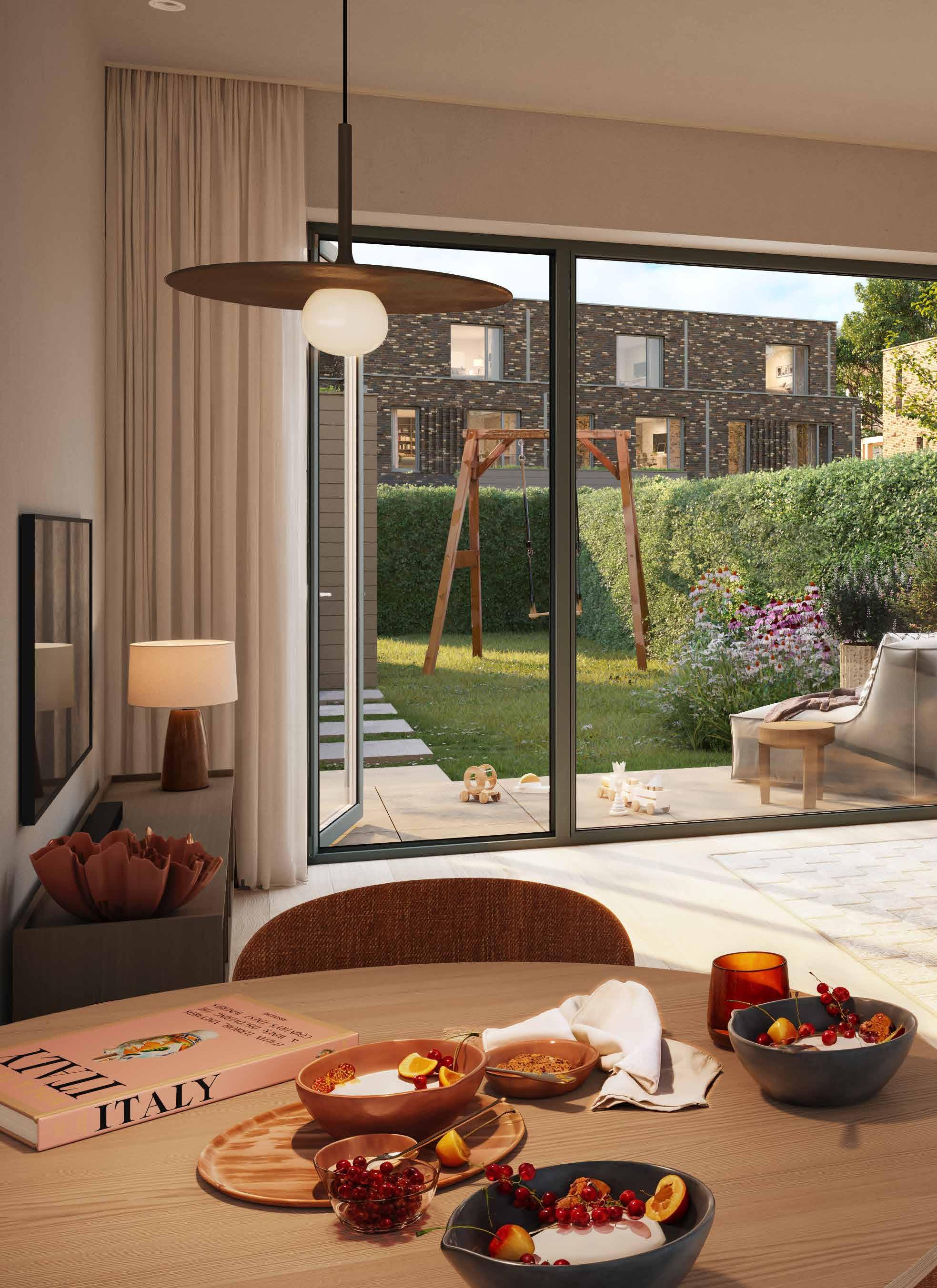 Speels verspringende woonblokken zorgen voor afwisseling. Je terras grenst aan het openbaar groen en is autoluw. De vaak diepe achtertuin is privé. Daarachter parkeer je je auto. Bij de tweelaagse woningen parkeer je op eigen terrein. Een luxe badkamer met sanitair van Villeroy & Boch is inclusief. De keuken daarentegen stel je, naar eigen creativiteit en budget, zelf samen. In de zomer zorgt de slimme vloerverwarming voor verkoeling in huis.
