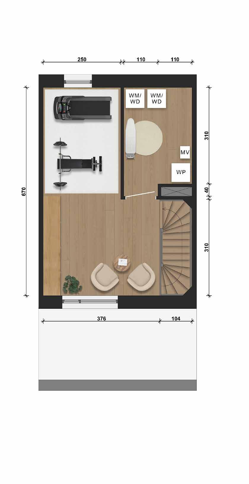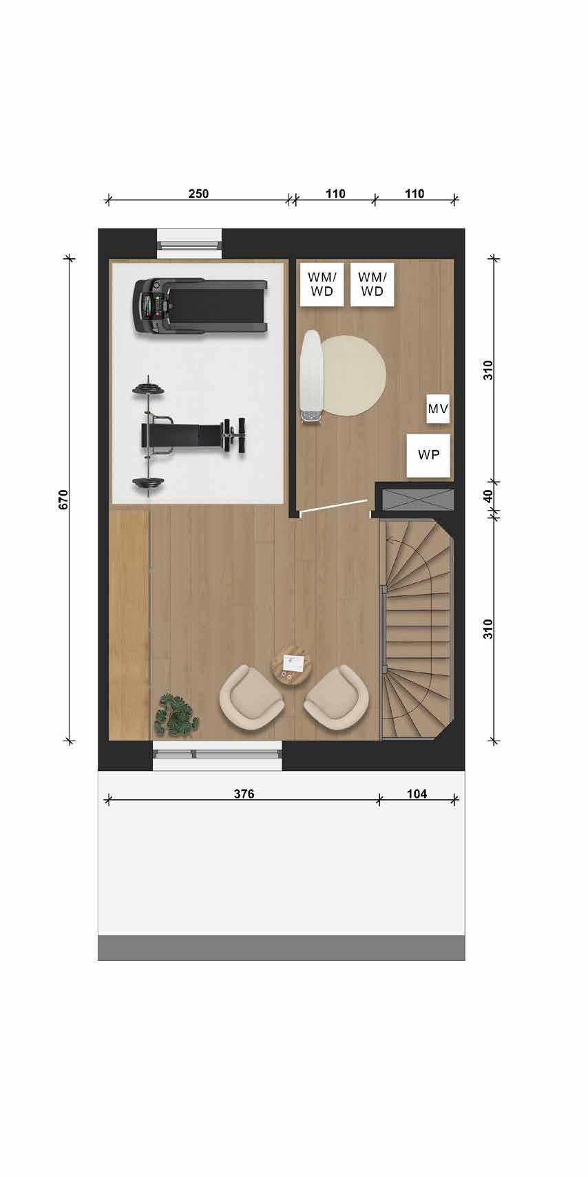 Drie types. Er is keuze tussen een compacte tweelaagse hofwoning van ca. 72 m² of een hofwoning met drie lagen van ca. 119 tot 169 m².