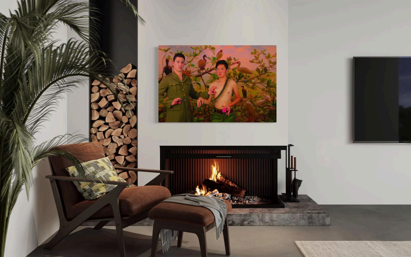 OIL AND SPRAY PAINT ON CANVAS WITH GUIDED FRAME AND PLASTIC TOYS
