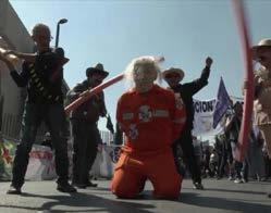 Durante la manifestación, una persona vestida con uniforme carcelario y una máscara con el rostro del presidente estadounidense fue presentada de forma simbólica como detenido, en protesta por lo que consideraron el secuestro del líder venezolano.