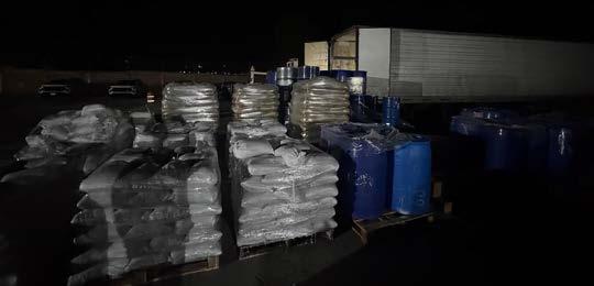 De acuerdo con información publicada por Infobae, entre los materiales asegurados se encuentran 300 costales con 7 mil 500 kilos de acetona de plomo; 36 costales con 900 kilos de ácido tartárico; 20 tambos con 4 mil litros de etanol; 100 kilos de una sustancia blanca aún sin identificar; 4 mil 500 kilos de sosa cáustica y 3 mil litros de líquidos no etiquetados.