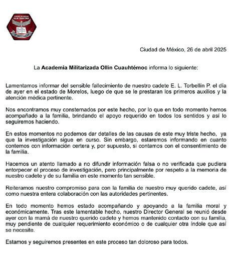 La muerte de Erick Leonardo Terán Torbellín, de 13 años, ha desencadenado una ola de denuncias por presuntos abusos sistemáticos dentro de la Academia Militarizada Ollín Cuauhtémoc, tras participar en un campamento en el estado de Morelos organizado por la institución sin autorización oficial. Erik ingresó al campamento el miércoles 23 de abril, en buenas condiciones de salud, según su madre, Erika Torbellín. Dos días después, recibió una llamada desde la academia informándole que el menor tenía “un poquito mal sus signos vitales”. Al llegar al lugar, encontró a su hijo sin vida.