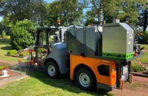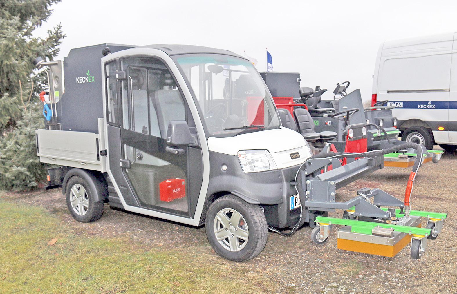 To produkter fra det nye selskab CCD, der passer perfekt sammen. Keckex-varmtvandsanlægget tager sig af ukrudtet i front, og Club Car med tank på ladet medbringer vand til opgaverne.