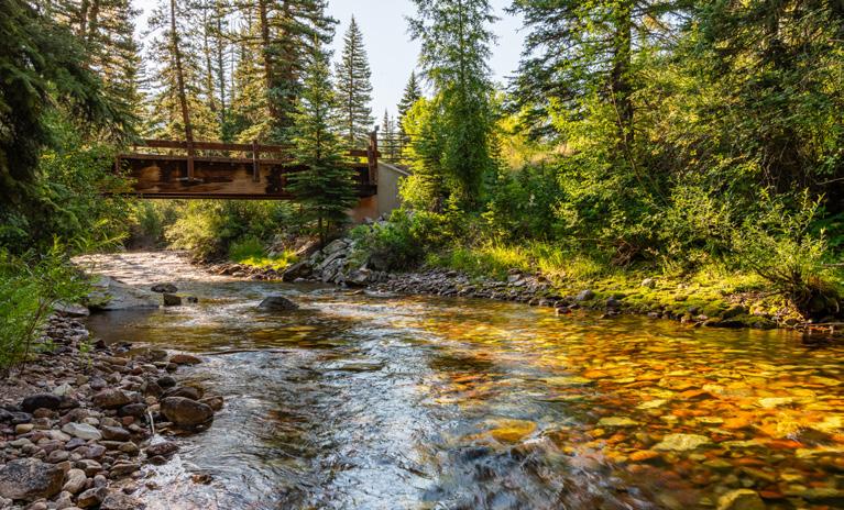 SNOWMASS VILLAGE Tucked in a quiet setting, this lovingly cared for mountain home features many indoor and outdoor gathering spaces and spectacular mountain views. Enjoy this compellingly priced home as it is or seize the opportunity to expand. Expansive windows fill the home with natural light. Knotty red oak floors, vaulted ceilings and beams create a mountain ambiance in the spacious main living/dining/ chef’s kitchen area that opens to a wrap-around deck. The generous, loft-like primary suite features an office, sitting area, private deck, laundry room, and large steam shower. The lower guest level with living area, two generous bedrooms and a bath, walks out to a patio. Take in far-reaching mountain views from the flat ½- acre backyard with firepit area, aspen and evergreens, and perennial gardens.