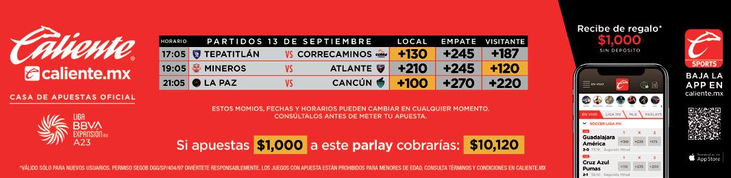 APUESTA AL PARTIDO JAGUARES DE C. +240 EMPATE +220 AMÉRICA DE CALI +120 APUESTA AL PARTIDO CD TEPATITLÁN +130 EMPATE +245 CORRECAMINOS +187 APUESTA AL PARTIDO ATLETICO LA PAZ +100 EMPATE +270 CANCÚN FC +220 APUESTA AL PARTIDO BOYACÁ CHICÓ FC +160 EMPATE +200 INDEPENDIENTE SANTA FE +19 APUESTA AL PARTIDO DEPORTIVO PEREIRA -118 EMPATE +235 DEPORTIVO PASTO +333 APUESTA AL PARTIDO MINEROS DE ZACATECAS +180 EMPATE +240 ATLANTE +137 MIÉRCOLES 13 DE SEPTIEMBRE DE 2023 8