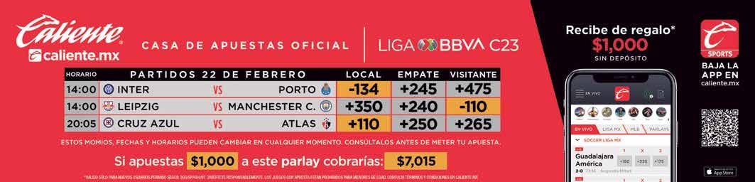 APUESTA AL PARTIDO CD TEPATITLÁN +105 EMPATE +245 MINEROS +235 APUESTA AL PARTIDO CRUZ AZUL +110 EMPATE +250 ATLAS +265 APUESTA AL PARTIDO PUMAS TABASCO +240 EMPATE +235 CLUB CELAYA +110 MIÉRCOLES 22 DE FEBRERO DE 2023 9 FOTOS: TWITTER / CUARTOSCURO