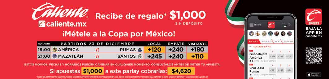 se publica de lunes a viernes y su distribución es gratuita. Reserva Número 04-2018022309315500-101. Certificado de Licitud de Título No. 14382. Certificado de Licitud de Contenido No. 11955. Otorgados por la Comisión Calificadora de Publicaciones y Revistas Ilustradas. Editado y distribuido por Más Información con Más Beneficios S.A. de C.V. Calle Juan de la Barrera 112, Piso 2, col. Condesa, alc. Cuauhtémoc, C.P. 06140, Ciudad de México. Tel. 5395-0853. Redacción: Calle Juan de la Barrera 112, Piso 2, col. Condesa, alc. Cuauhtémoc, C.P. 06140, Ciudad de México. Certificado de Derechos de Autor, (Indautor). Inscripción al Padrón Nacional de Medios Impresos de SEGOB Registro en el PNMI: 28/04/2009. Prohibida la reproducción total o parcial. Impreso en Impresora de Periódicos Diarios, Acalotenco 80, col. Santo Tómas, alc. Azcapotzalco, C.P. 02020, Ciudad de México. máspormás Más Información con Más Beneficios, SA de CV Registro Moctezuma & Asociados número 37 Vigencia: febrero 2019-enero 2020 ¡JUEGA CON NOSOTROS! VIERNES 23 DE DICIEMBRE DE 2022 15