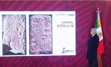 El Instituto de Antropología e Historia dio a conocer que en la Zona Arqueo lógica de Uxmal, en Yucatán, fue descubierta una estela maya labrada en am bas caras. Al participar en la conferencia del presidente Andrés Manuel López Obrador, el director del organismo, Diego Prieto Hernández, destacó que di cho hallazgo derivó de las obras del Tren Maya. En su costado norte muestra a una deidad femenina de ojos grandes, barbillas en la comisura de la boca y pecho descubierto. En tanto, en el flanco sur contiene la imagen de una deidad masculina, con un tocado de ala ancha, adornado con plumas y una cabeza de lechuza; también tiene brazaletes y vendas en las piernas. (Sopitas)