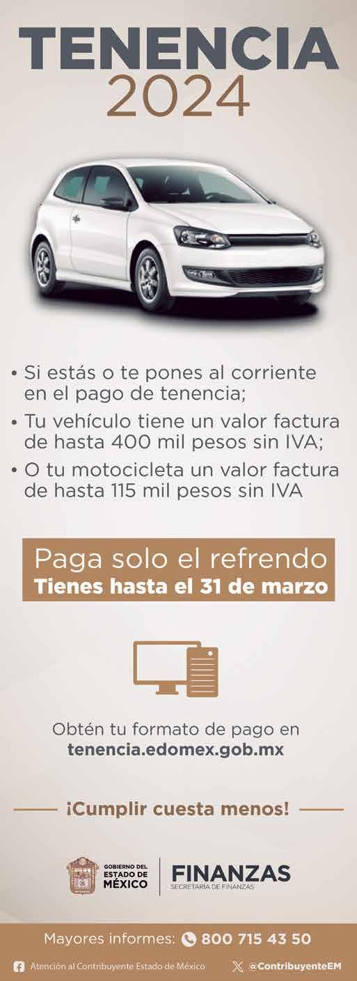 La Secretaría de Administración y Finanzas de la CDMX señaló que la ciudadanía tiene hasta el 31 de marzo para obtener el 100% de descuento en el pago de tenencia vehicular, al cubrir su refrendo de 698 pesos. Por medio de un comunicado, mencionó que para ello es importante no contar con adeudos de años anteriores, tener vigente la tarjeta de circulación con chip o hacer el pago correspondiente a la renovación a través del sitio web finanzas.cdmx.gob.mx o mediante la aplicación Tesorería CDMX. Indicó que adicionalmente, la Tesorería cuenta con más de 8 mil 800 puntos de cobro que incluyen instituciones financieras, tiendas de autoservicio, departamentales, de conveniencia y farmacias. La dependencia igualmente refirió que los pagos se pueden hacer a meses sin intereses con tarjetas y en lugares participantes; para conocerlos, ingresa al link: https://bit.ly/3TW4NoA