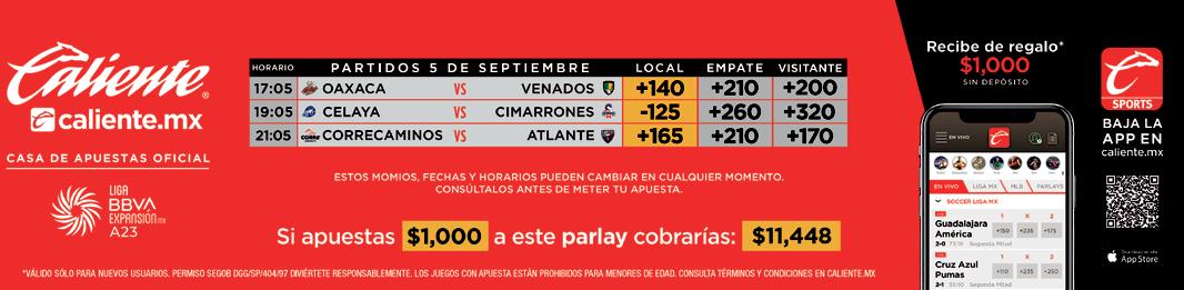 APUESTA AL PARTIDO G. Y E. MENDOZA +105 EMPATE +190 NUEVA CHICAGO +270 APUESTA AL PARTIDO CLUB NECAXA (M) +225 EMPATE +230 CRUZ AZUL (M) +110 APUESTA AL PARTIDO PACHUCA (M) +125 EMPATE +240 MAZATLÁN (M) +210 APUESTA AL PARTIDO UNIÓN DE SANTA FE +155 EMPATE +195 SAN LORENZO +200 APUESTA AL PARTIDO CA BARRACAS C. -106 EMPATE +230 ARSENAL DE S. +300 APUESTA AL PARTIDO ATLAS (M) -400 EMPATE +450 SANTOS LAGUNA (M) +750 LUNES 4 DE SEPTIEMBRE DE 2023 8