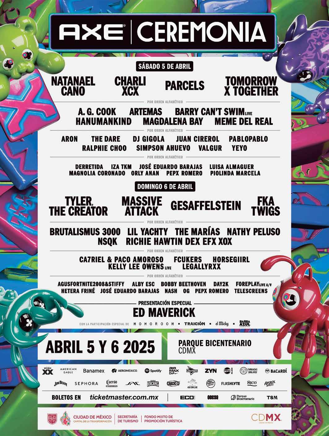 Nuestro querido AXE Ceremonia 2025 está muy cerca, pues se realizará los próximos sábado 5 y domingo 6 de abril en la CDMX. Y ya sea que tengas tus boletos en mano o aún te la estas pensando si ir o no, en Chilango nos armamos una guía con todito lo que tienes que saber. Para empezar, ésta será la decimosegunda edición del festival que ya es considerado uno de los eventos más importantes de México. El anuncio de la primera edición llegó en 2013, causando gran expectativa al tratarse de un evento gestionado de forma independiente, pero con una propuesta muy clara e interesante. En ese entonces estaba planeado que la sede fuera en Xochimilco con un cartel que incluía a gran parte del sello Ed Banger y a Animal Collective como headliners Finalmente el venue fue cambiado al Foro Pegaso en Toluca.