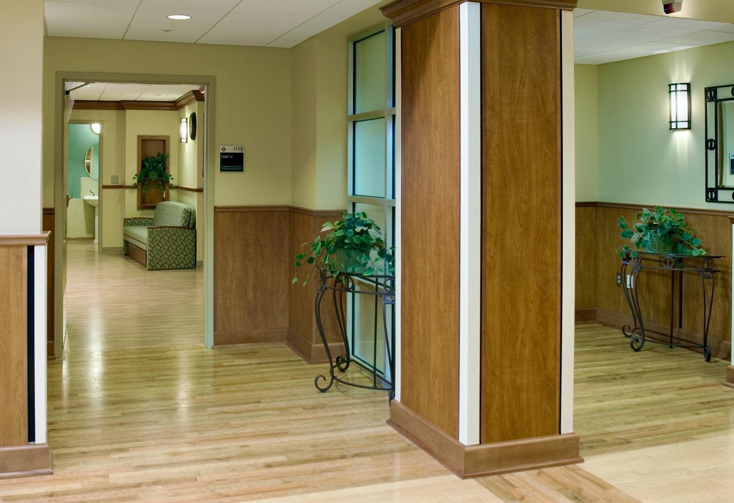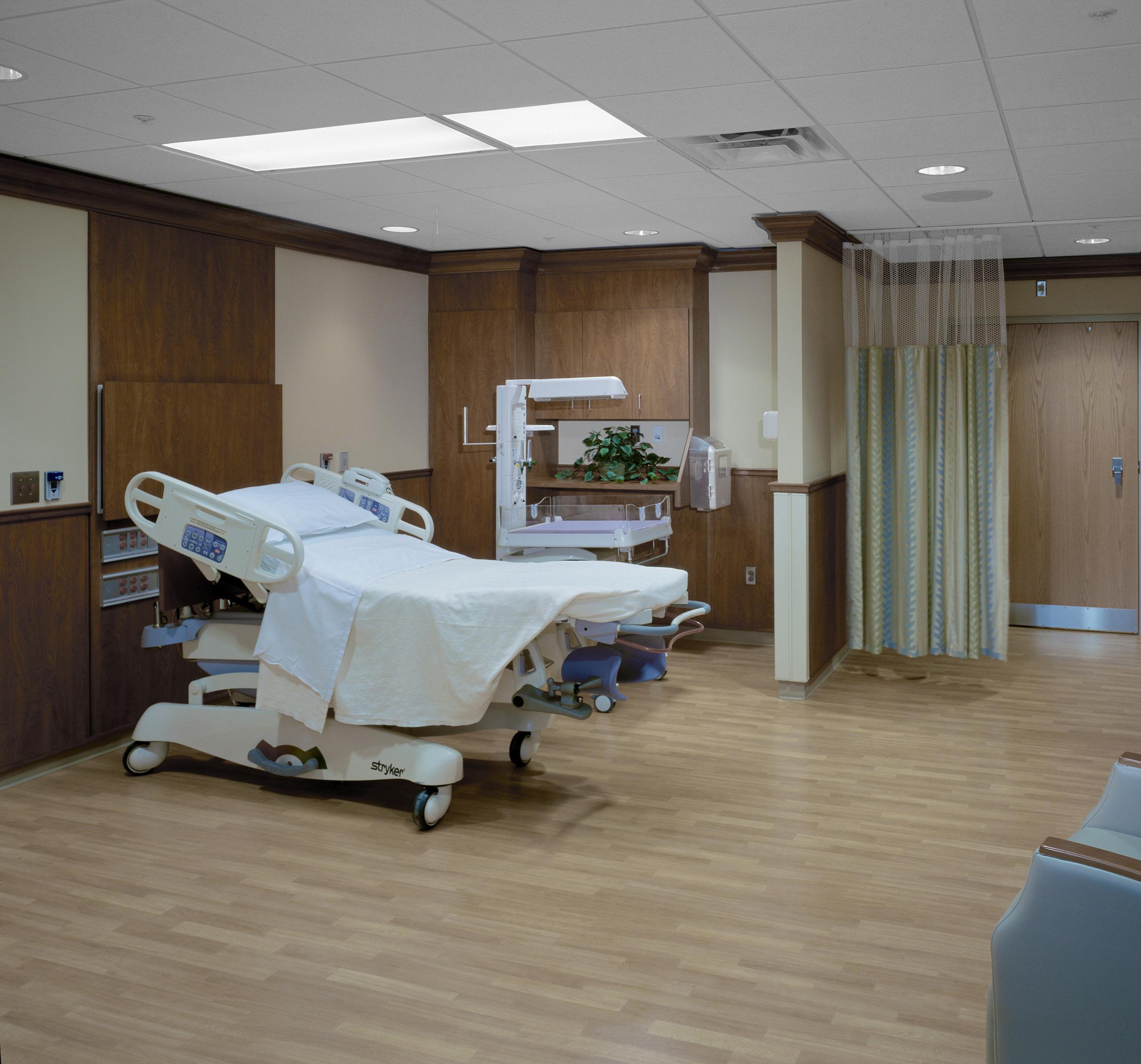 St. Mary’s new single room maternity suites have all the amenities an expectant mom would want for her family to be comfortable before, during and after the birth. Overnight accommodations, DVD’s, data points, Sanijet NSF approved whirlpools, etc. create the Ritz impression. Private foyers outside the room allow family to step outside while the Doc examines and serves as a staff communication point in between births. Suites are ACOG parametered, acoustically isolated and visually screened. The unit is designed for maximum staff efficiencies whether for high or low volume. Support services are located close by to improve staff efficiency. Daylight floods the unique interior 3 story Birthing Atrium and supports the Renaissance Revival design concept. Staff and Docs were heavily involved through field trips and mock-up validation. All this in a 12 foot floor to floor height!