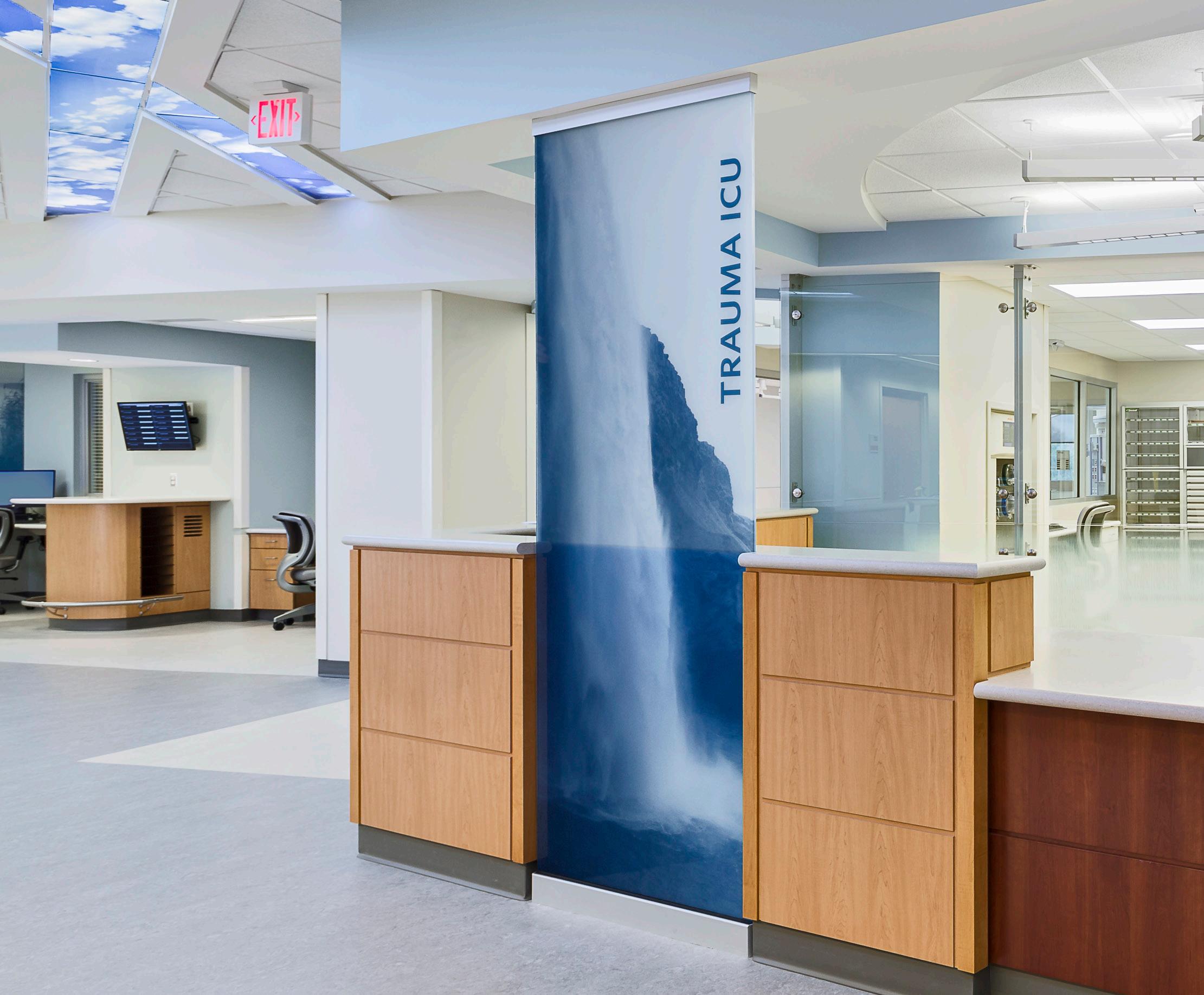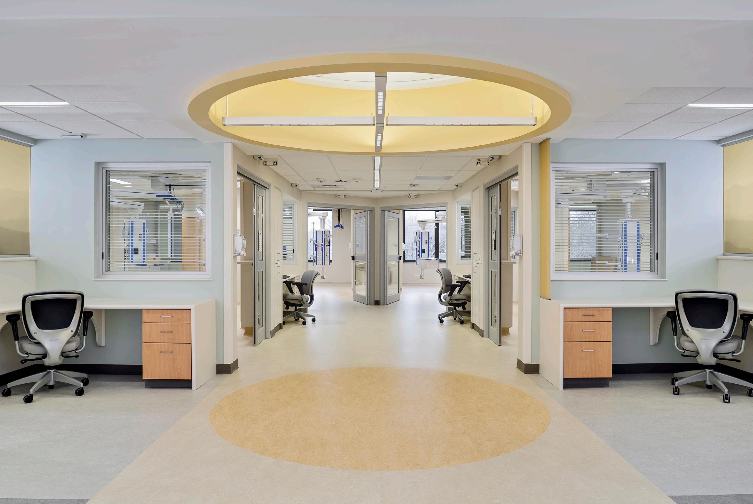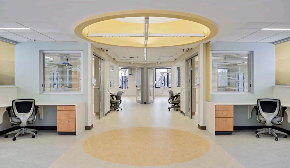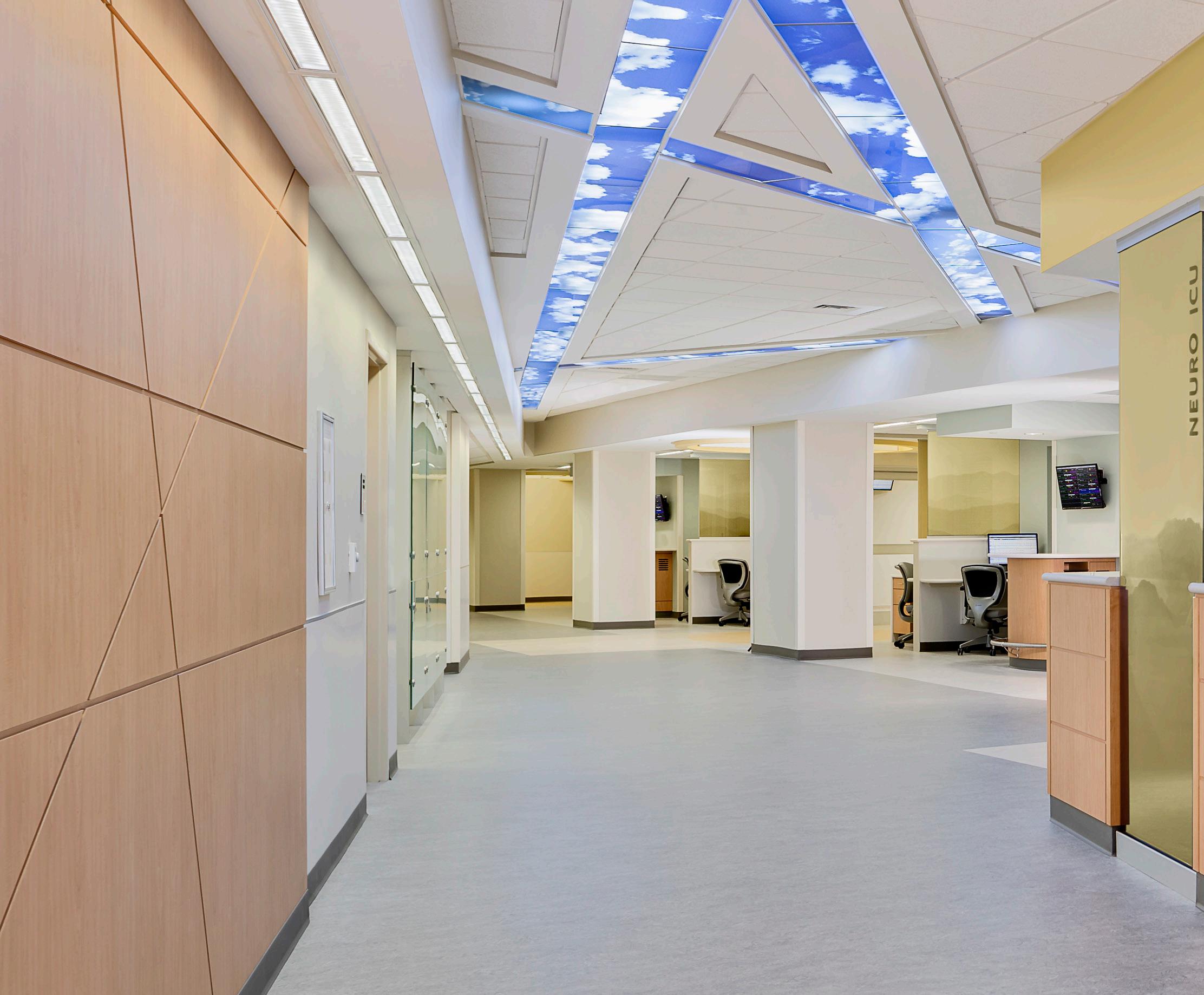 Intensive Care Unit as the first phase of improvements to the entire neurosurgical service line. The design incorporates all of the leading patient care and family design features and is configured for future growth. Located at the front door to the hospital, the new design will establish an aesthetic platform from which subsequent projects will borrow from to begin the modernization of the 60’s era plant.