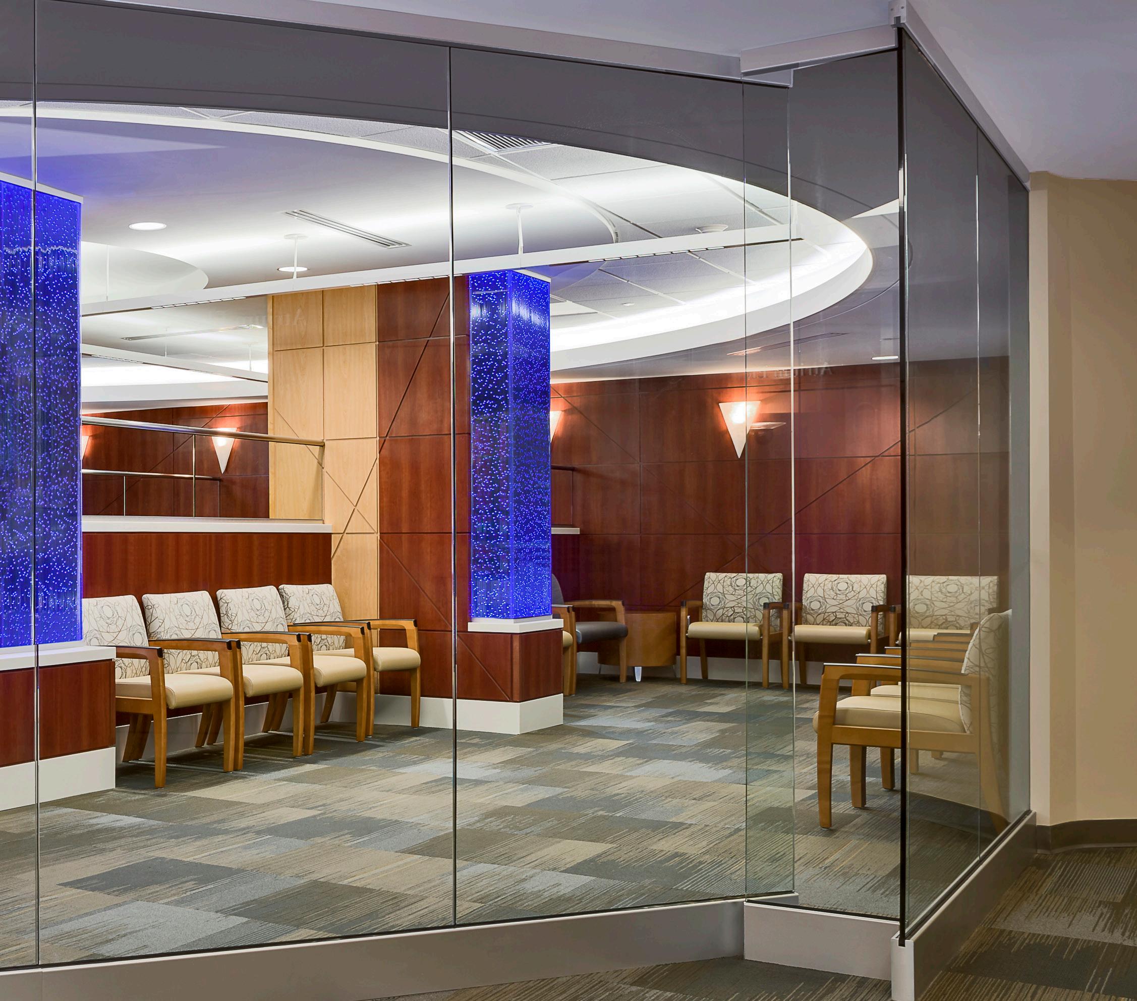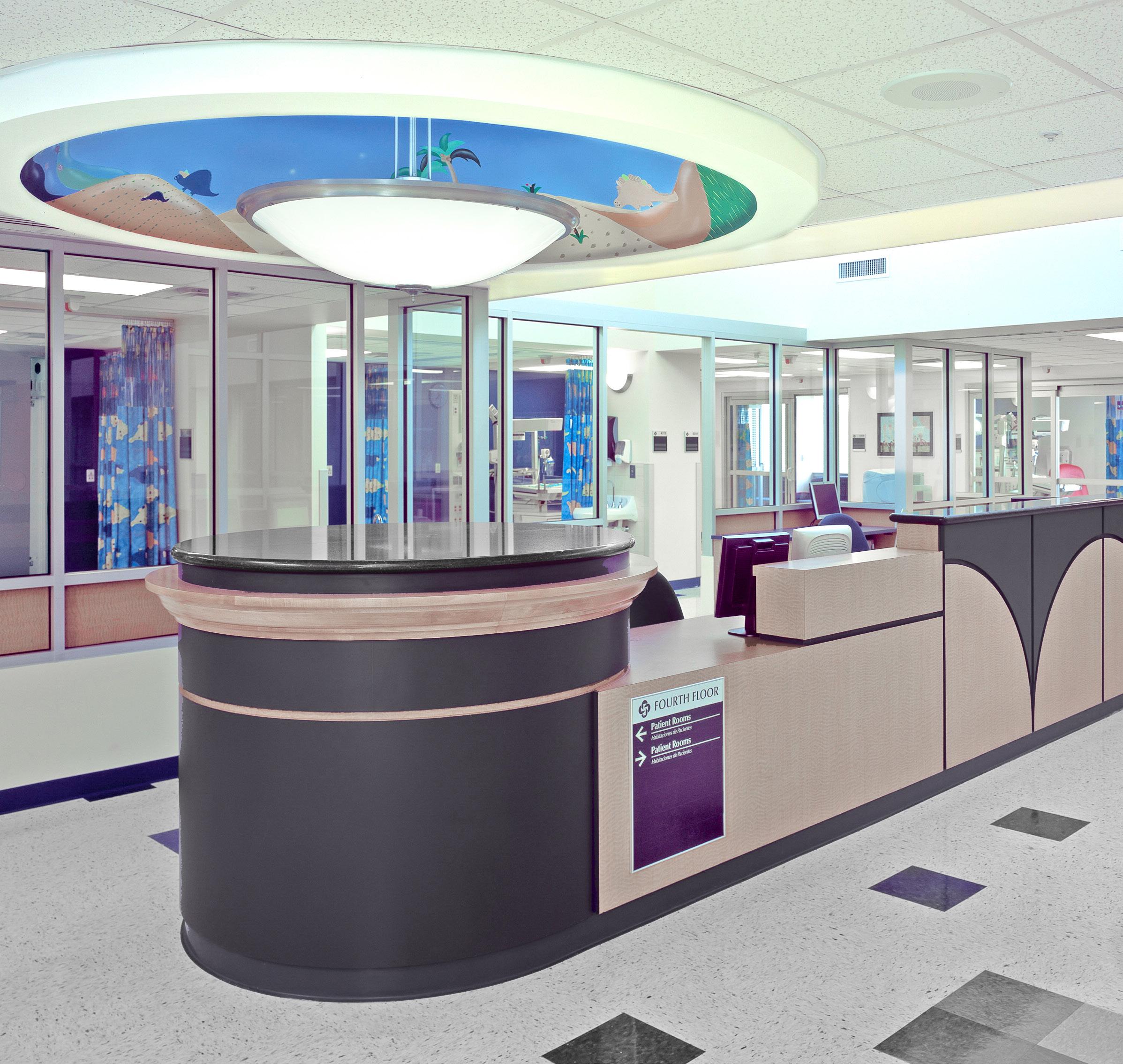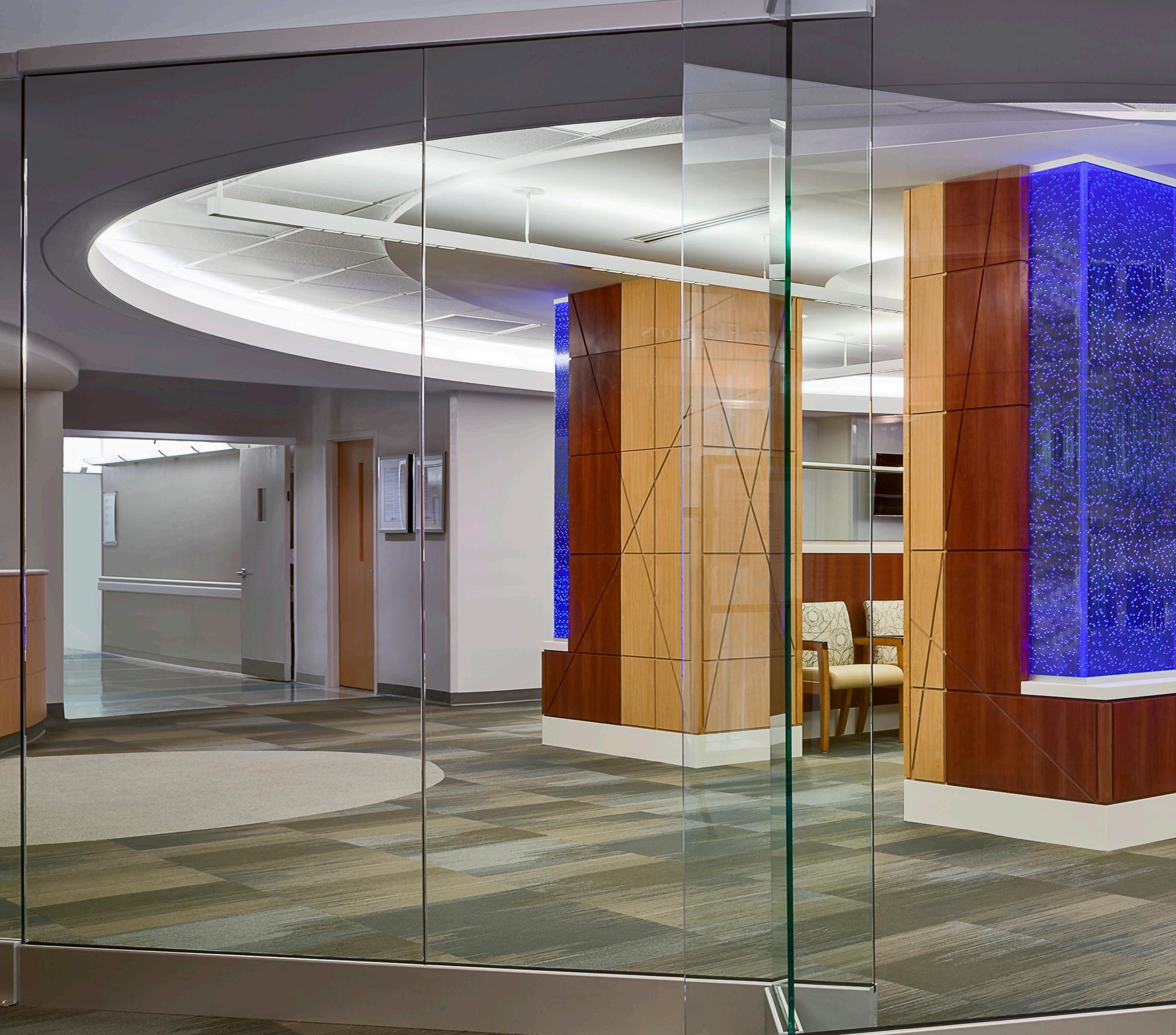 Intensive Care Unit as the first phase of improvements to the entire neurosurgical service line. The design incorporates all of the leading patient care and family design features and is configured for future growth. Located at the front door to the hospital, the new design will establish an aesthetic platform from which subsequent projects will borrow from to begin the modernization of the 60’s era plant.
