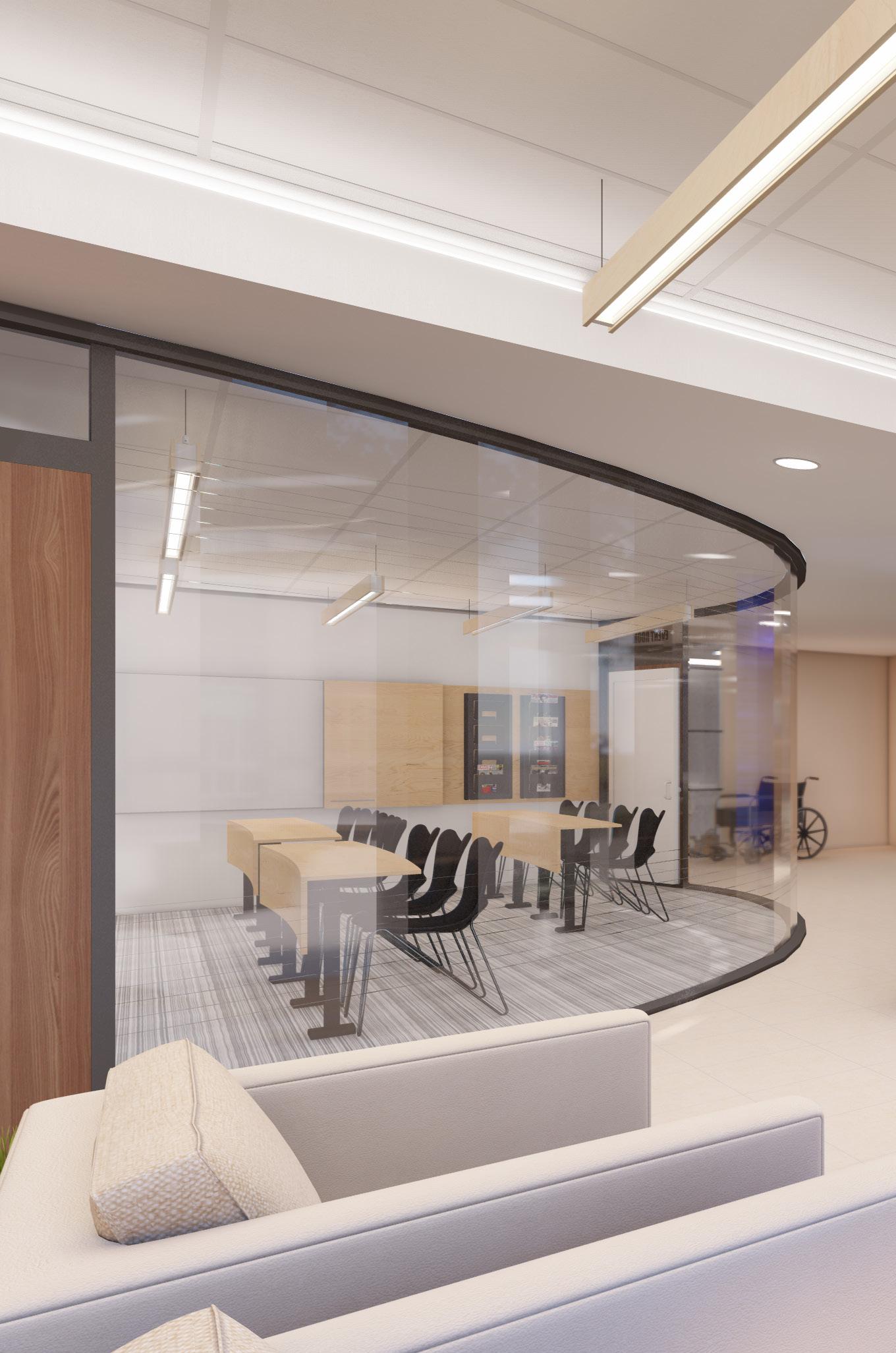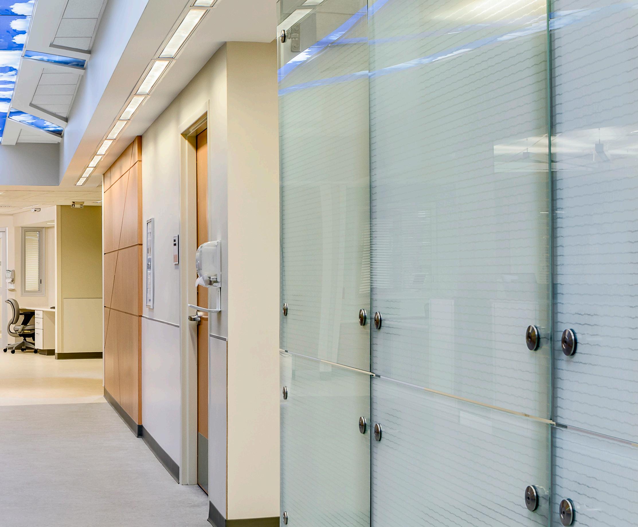 This design effectively reduced the linear footage requirements along an outside wall by up to 35%, while still meeting the code driven natural light requirements to patients. By using internal “Lightscapes”, a small room designed to pass light to another room, MMA was able to fit 8 rooms in the space that could originally only support 5. The design of this concept additionally allowed for increased staff productivity by allowing a single nurse to comfortably monitor 4 or even 8 rooms with a minimal amount of walking.