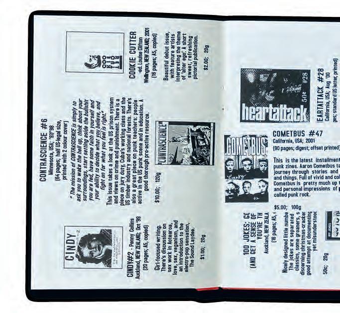 Tessa Stubbing The first zine I ever came across was something called Punk Brazil, which I found in Real Groovy Records when it was on Queen Street. Maybe it was dropped off by a tourist or a traveller or someone who’d immigrated here. Real Groovy had a little rack in the doorway where you’d have all the flyers and stuff. Someone had dropped Punk Brazil in there. I don’t know if there were more zines there at the time, I just remember that one because I grabbed it and I was like ‘This is cool, oh my gosh.’ The printing wasn’t even double-sided, each page of content sat next to a blank page. It was pretty low-budget, and that was cool. Did I know it was called a zine? No, I don’t think so. We’d just got internet at home with a 14.8K modem — so, so slow. I looked up punkas. com, and from there I found out that this thing was called a zine, and then I found Moon Rocket zine distro. That’s where I used to order all my zines from.