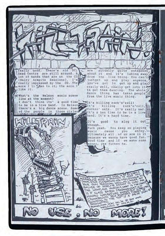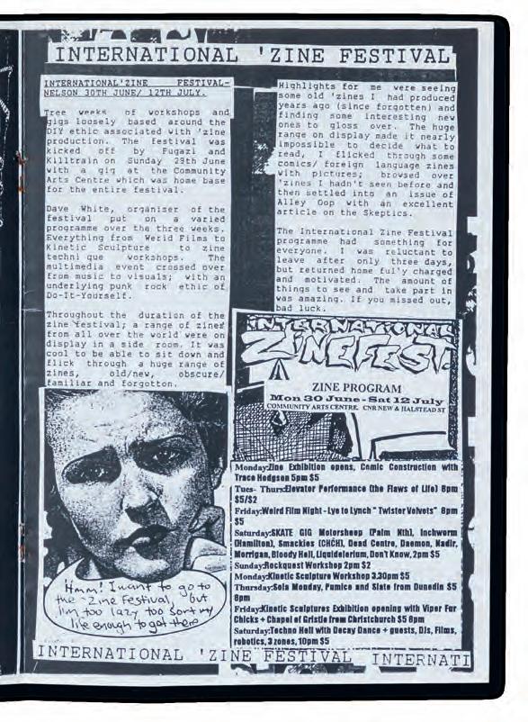 judge and he says ‘Dave Hegan’s pleaded guilty to burglary’, and I’m like ‘What!? This is news to me.’ Life changed really dramatically. I got a year’s probation and I got sent to drug rehab, which was actually a good thing because I was doing a Sid Vicious — crash and burn, die young. I ended up coming back to Christchurch to live with my mum. It’s weird, you’ve got to sober up before you go to drug rehab. At least that’s how it was back then. You had to have a few weeks clean before you could go to Queen Mary Hospital in Hanmer. It made sense for them. There was six months of drying out in Christchurch before rehab. All of a sudden I had all this time on my hands because all I’d been doing was getting wasted, hitchhiking around the North Island and going to gigs, so that’s when I decided to do a zine. I was really into all the bands and the politics and stuff, so I just started posting interview questions off to bands and asking all my mates if they wanted to contribute. I had all this energy. I was also screenprinting and all sorts of other stuff. I got out of rehab in November ’89 after six weeks, and then I published my first zine in early 1990.