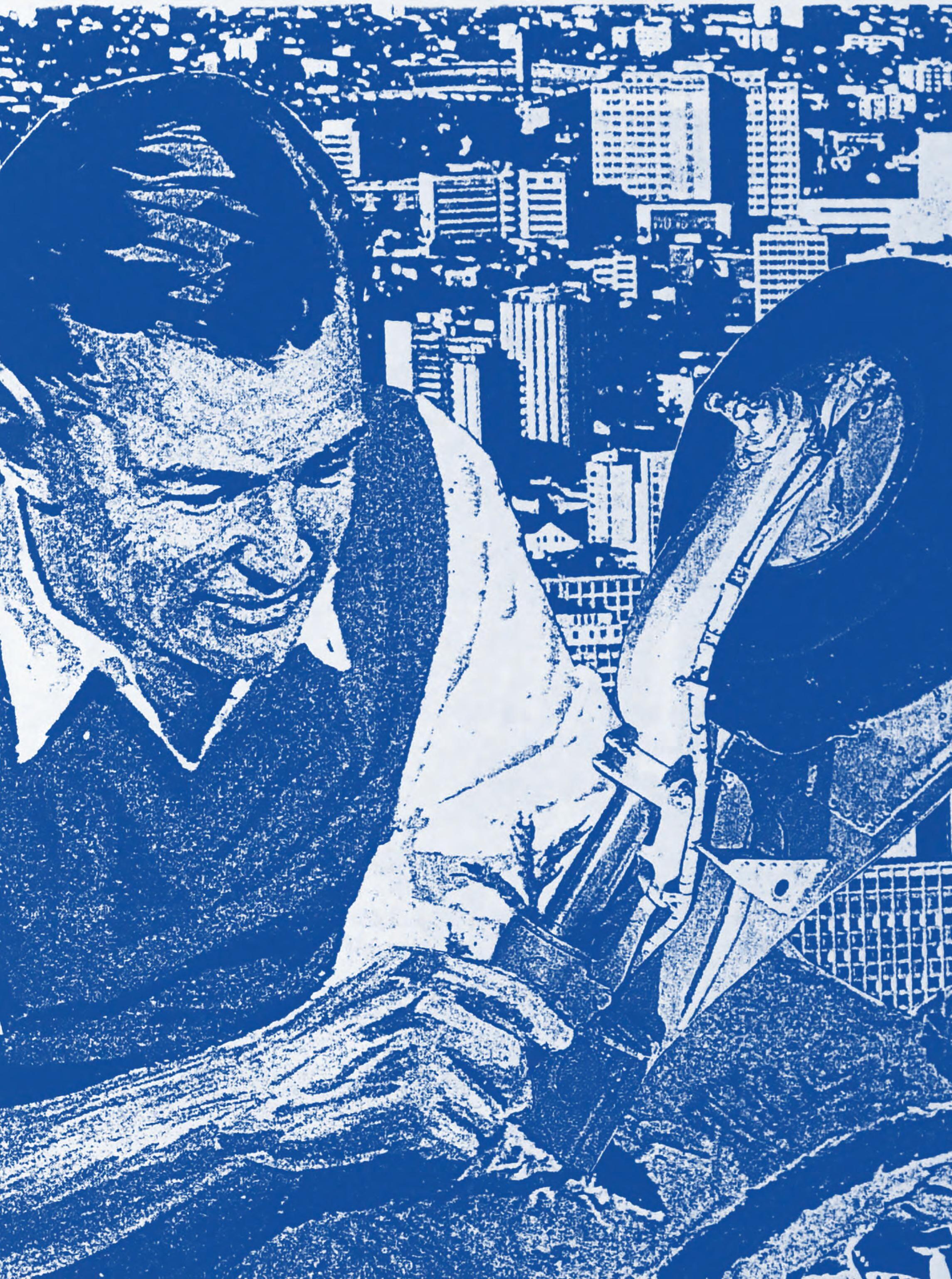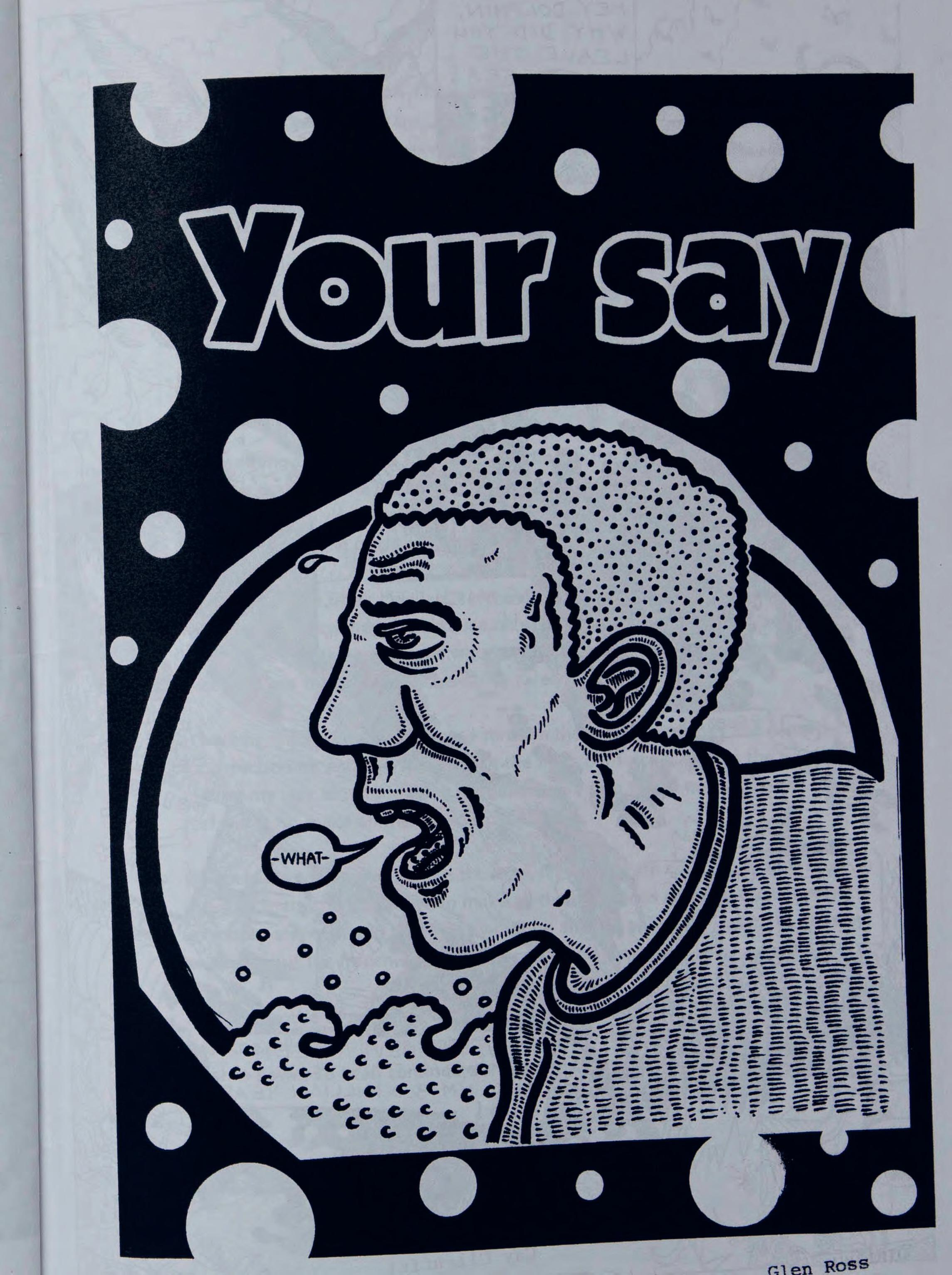 Lyn Spencer And you could get little pictures made up — what were those called again? Ross Gardiner Polymer blocks. Lyn Spencer Polymer blocks, yeah. So, you’d get a picture and put it on the press, if you wanted a logo for your zine or something then you could just use that to make pictures as well. Ross Gardiner Print it in colour. Yeah, it was basically like woodcutstyle printing.2 You’d just take a picture into some [graphic reproduction] company, and they’d duplicate it onto a sort of plastic resin-type stuff [and mount the resin image on a piece of wood]. So, you could make any graphic into a raised block, and then you’d print it on a letterpress machine. It could be a photograph or just a line drawing or whatever.