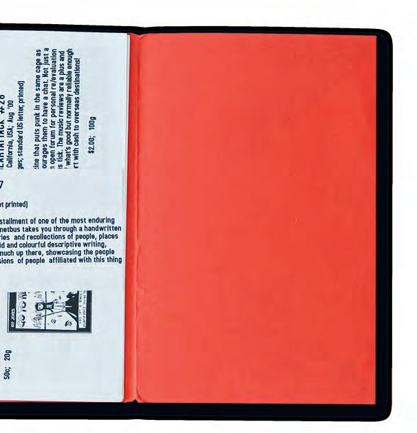 Kerry Ann Lee Red Letter Zine Distro was born after I finished design school and I realised that I had accumulated a whole bunch of really wonderful friendships and pen pals through zine-making and I was bringing stuff into New Zealand. I was swapping records for zines and zines for records and things from here in New Zealand for overseas, getting all these packages and letters and circulating them, I’m thinking ‘Shit, it’s more than just my friends who’d be interested in this stuff. I’m gonna try this out . . .’ Do a wee distro inspired by international distros overseas that would stock their favourite records and zines and do a really faithful job of promoting them. So that’s what the distro was about. It was gonna be a mail-order distro, and that was why I loved the idea of the catalogue, the idea that you actually go through and — like the school book clubs when you’re a kid — tick the books/zines you want.