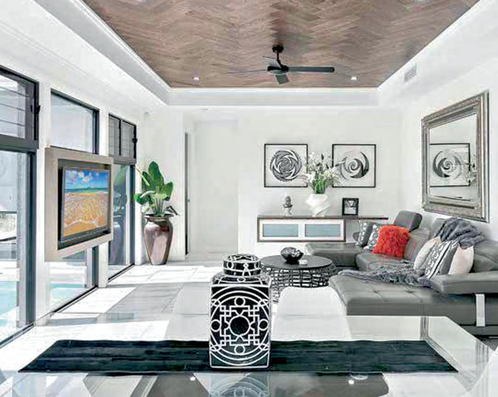 The flamboyance of the Caribbean is captured in part by the vast swimming pool, man cave, bar and gym on the ground level. The home is elegantly complemented with a vibrant furniture package by Carole Tretheway Design, which caps off a beautifully appointed home.