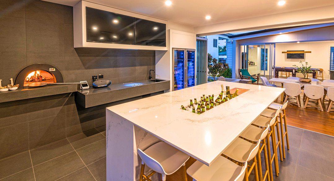 There’s a built-in wood fire pizza oven and a built-in ice tray hidden away in the central bar