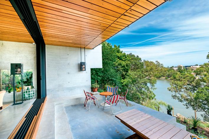 The three-storey building sits atop substantial earthworks, footings and cliff retention systems high on the banks of the Brisbane River overlooking the University of Queensland and the client’s private jetty.