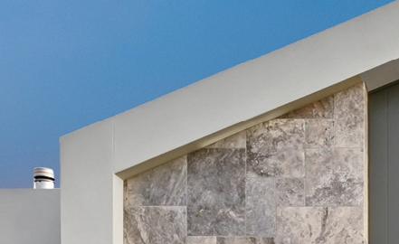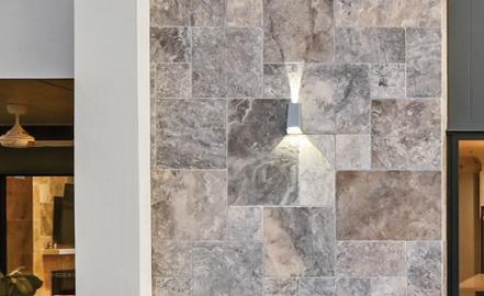Natural light floods the dining and living room through extralarge windows. A feature fireplace of matching French pattern travertine tiling to the external walls takes centre stage.
