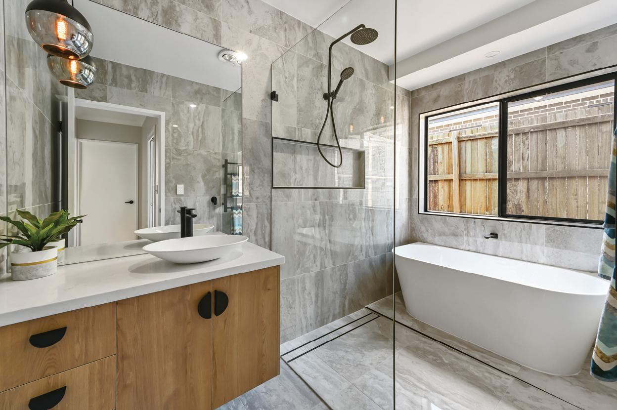 There is also separate powder room, laundry, double garage, study nook and main bathroom, with wet room style layout including free-standing bath and walk-in shower.