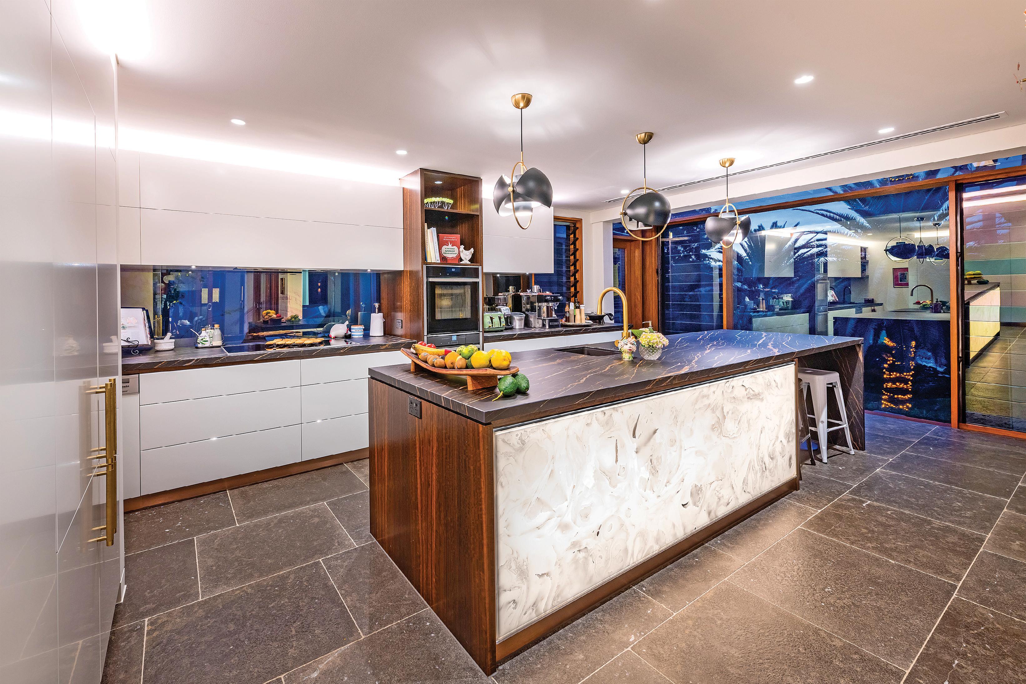 Opposite in the living space is a gourmet kitchen with a hidden butler’s pantry.