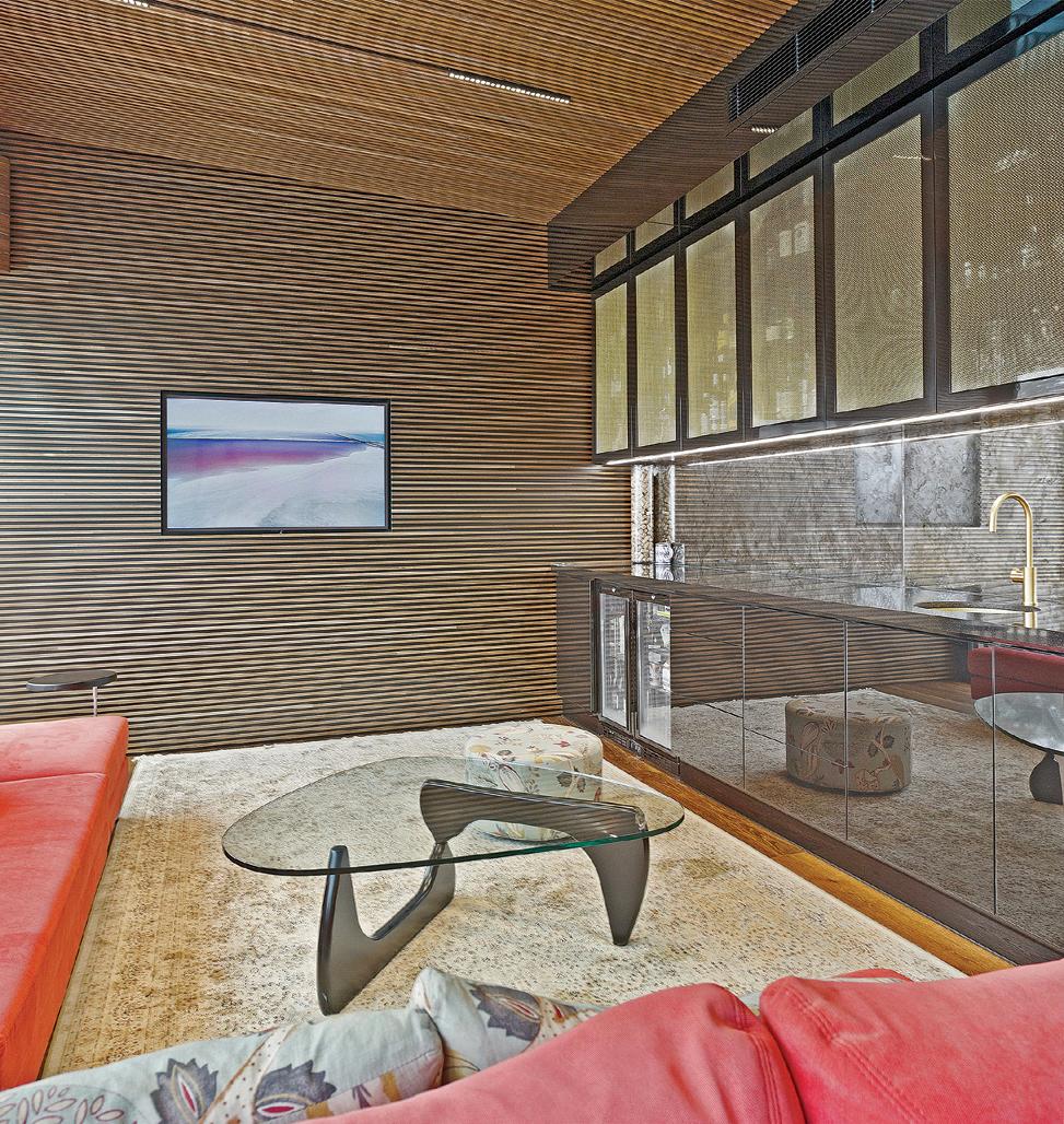 Designed by Jesse Bennet Studios, the home features four bedrooms and a guest suite (all with ensuites), a wine cellar, secret bar, a rooftop bar, multiple indoor and outdoor areas, and accommodation for eight vehicles.
