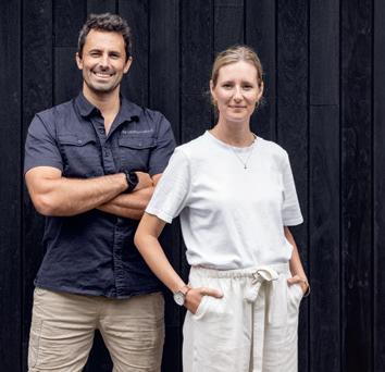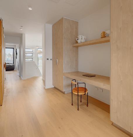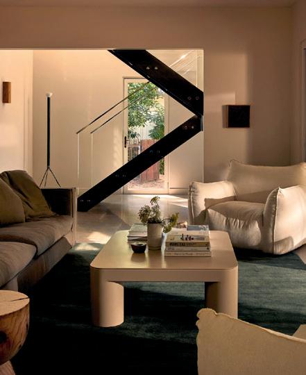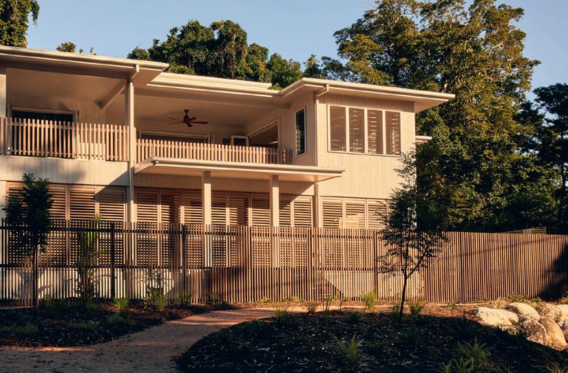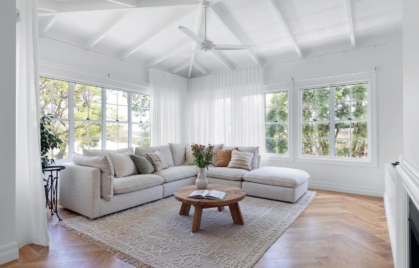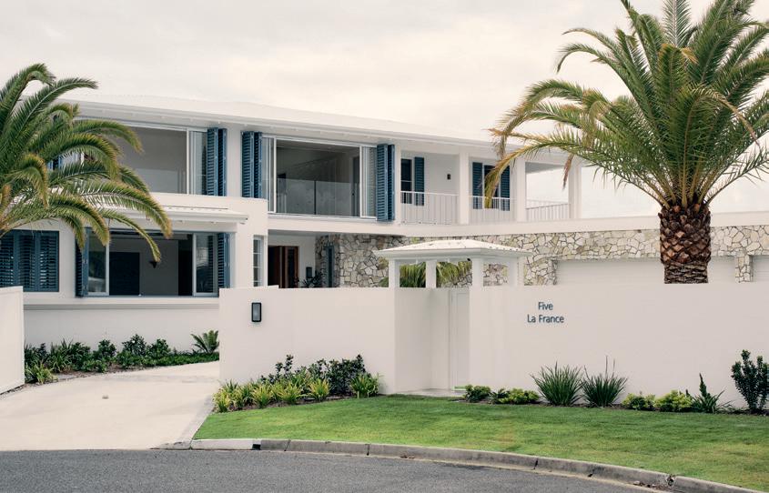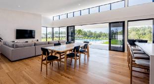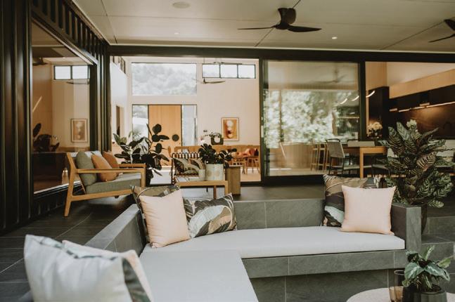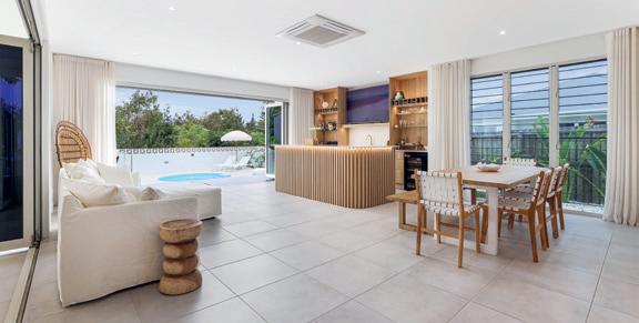 of the nearby public parkland and beach. For a young family that loves to entertain, it was crucial the design include expansive outdoor living spaces. Inside, the open-plan living area unfolds effortlessly into the outdoor spaces, with an articulated design that offers various seating options to shield from the ever-present south-easterly trade winds.