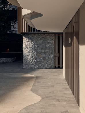 This central feature, with its recessed seating, creates a sense of expansive openness that distinguishes the home from even much larger properties. The zero-threshold entry, flanked by a curved stone wall and a grand timber door, sets the tone for the home’s recurring themes of curves and natural materials.