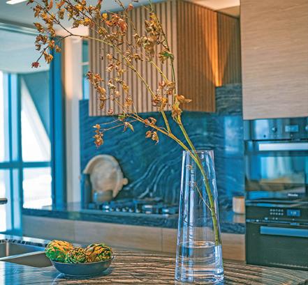Opposite in the living space is a gourmet kitchen with a hidden butler’s pantry.