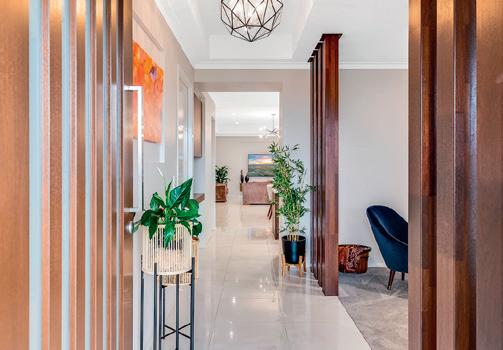 Stepping through the custom pivot door, the grand foyer features a vaulted timber clad ceiling, large, fixed glass windows, timber battens and luxurious stackstone which set the mood for the unique design elements within.
