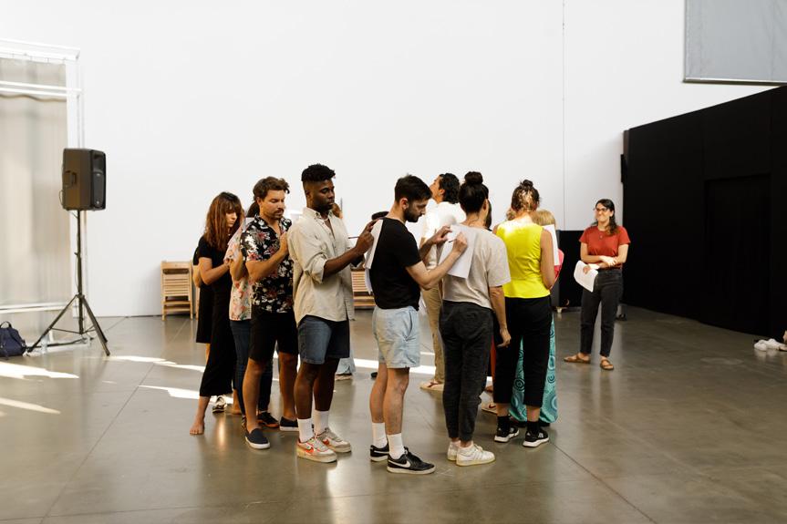 para poder llegar al siguiente nivel, al reconocimiento y al siempre lejano éxito. A ritmo de merengue house y repasando de manera compulsiva el listado de acciones a realizar durante una jornada laboral, el público lentamente va siendo seducido a formar parte de este delirio autoexplotador convirtiéndose en mano de obra para la mejora de la escena. Más allá de señalar la incompatibilidad de las temporalidades y narrativas neoliberales sobre nuestros cuerpos, la acción plantea estrategias — aunque estas puedan parecer poéticas y utópicas— que nos permitan romper con la inercia de la productividad capitalista y los mantras de la eficiencia y el consumo. No pares(sigue,sigue) explora el dormir y el acto de soñar como espacios de pausa donde no se produce ni se consume, un bastión donde evocar y pensar nuevos sistemas que nos permitan colectivamente romper con la temporalidad neoliberal del “24/7”.