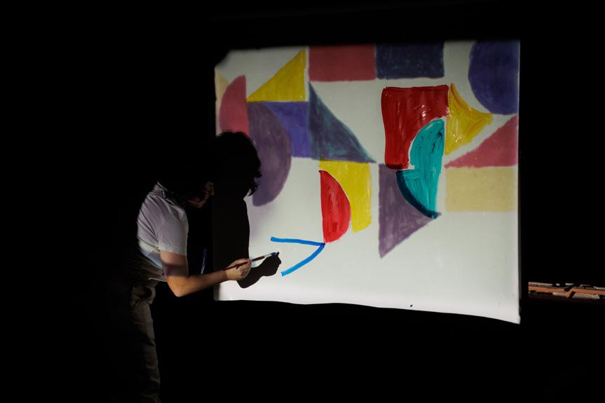 Registro de la performance Curso de pintura rápida para principiantes, Hacer/Ver, Elena Duque, abril de 2023. Proyección de 16mm sobre papel, pintura acrílica. Foto cortesía del Centro de residencias artísticas de Matadero Madrid.