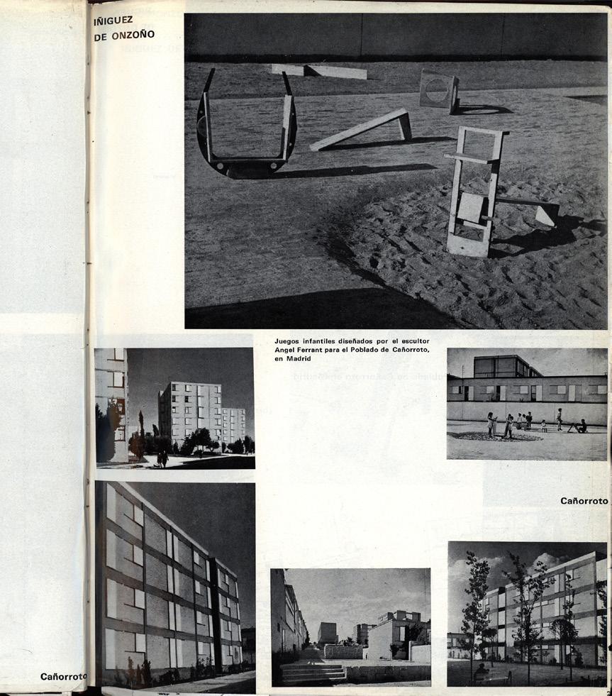 Caño Roto, construido en los años 50, empezó a levantarse con unas viviendas piloto colindantes con el Poblado Mínimo y el Poblado de Absorción, habitados principalmente por población gitana realojada. Como parte del plan, se proyectó un parque infantil compuesto de columpios cuya morfología sumaba a favor del discurso modernista de posguerra, y se tomaron fotografías que sirvieron para promocionar el barrio. La presencia de niños jugando en espacios ordenados, higiénicos, protegidos, era tema recurrente en las instantáneas de la época; la ausencia de adultos, no casual, pretendía mostrar un espacio público amable para ser usado con plena libertad, incluso por los menores. Los arquitectos que edificaron Caño Roto también construyeron su propia alegoría de niños vestidos de blanco almidonado procedentes de otros barrios jugando en la calle, a través de seis piezas de madera encargadas al escultor vanguardista